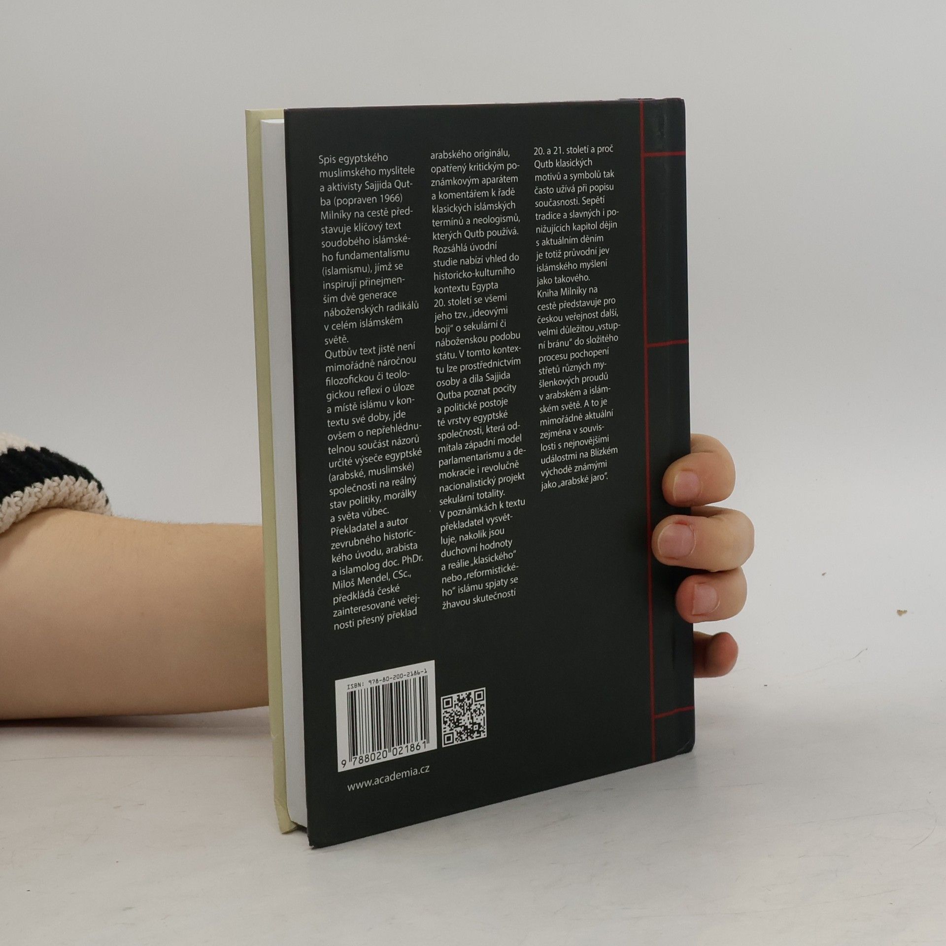 Spis egyptského muslimského myslitele a aktivisty, který byl popraven v roce 1966, představuje klíčový text soudobého islámského fundamentalismu, inspirující alespoň dvě generace náboženských radikálů po celém islámském světě. Překladatel a autor historického úvodu, český arabista a islamolog Miloš Mendel, nabízí české veřejnosti, intelektuálům, novinářům a studentům arabistiky, religionistiky a politologie přesný překlad textu, doplněný podrobným kritickým poznámkovým aparátem a komentářem k islámským termínům a neologismům, které autor používá. Mendelův úvod poskytuje vhled do historicko-kulturního kontextu Egypta 20. století a jeho ideových bojů o sekulární či náboženskou podobu státu. Vysvětluje pocity a politické postoje vrstvy egyptské společnosti, která odmítala západní model parlamentarismu a demokracie. Překlad je zamýšlen jako studijní text pro studenty arabistiky a islamologie a věrně sleduje arabský originál stylisticky. Tato práce představuje pro českou veřejnost důležitou „vstupní bránu“ k pochopení střetů různých myšlenkových proudů v arabském a islámském světě, což je obzvlášť aktuální v souvislosti s událostmi známými jako „Arabské jaro“.