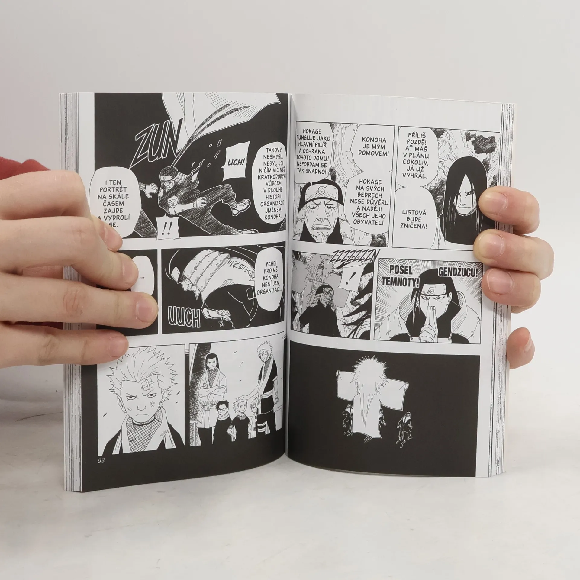 Zrada otřásá Konohou a uvězněný Hokage bojuje o záchranu své vesnice i vlastní život. Proti němu stojí zákeřný pletichář a jeho bývalý student, legendární Oročimaru, který si z používání zakázaných technik hlavu nedělá. V samotné vesnici se zatím na obranu staví rodiče a učitelé účastníků čúninských zkoušek a přidává se i další z legend, Džiraja. Mladí nindžové zatím vyrážejí po stopě zrádců z Písečné. Podaří se jim Gaarovu skupinu dostihnout?