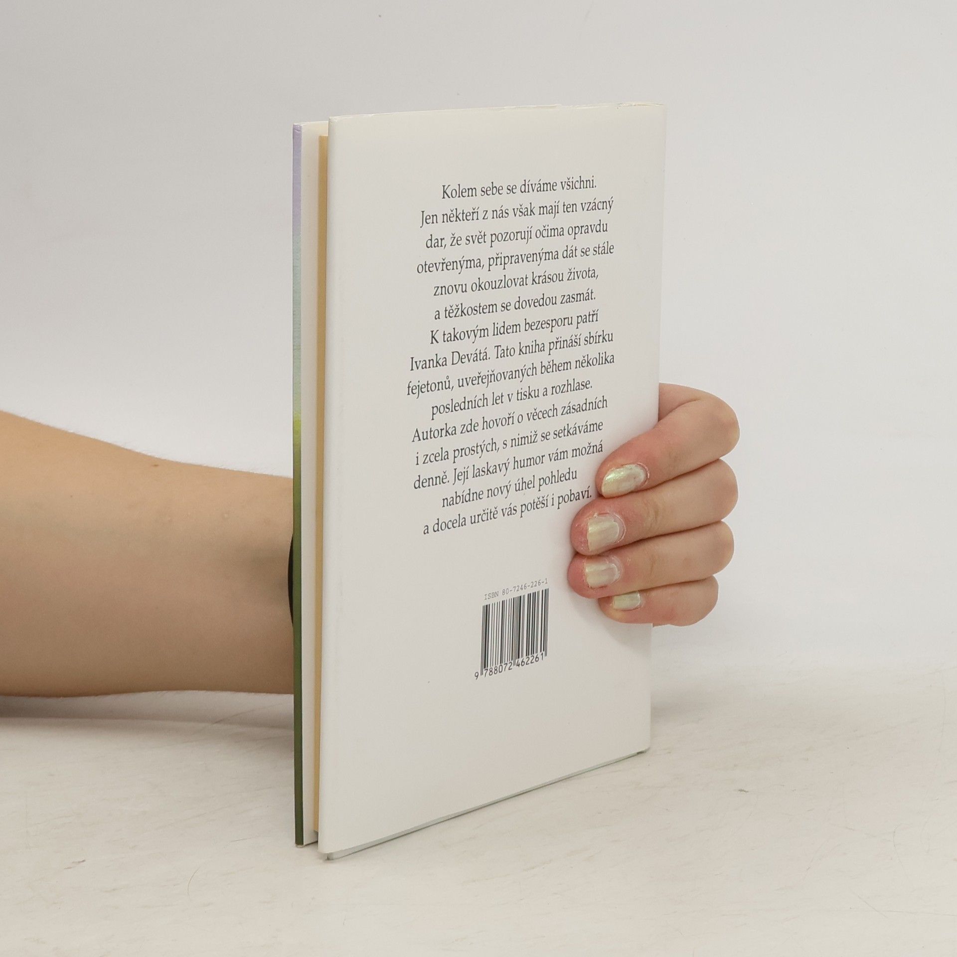Sbírka fejetonů, uveřejňovaných během několika posledních let v tisku a rozhlase. Autorka hovoří o věcech zásadních i zcela prostých, s nimiž se setkáváme denně. Její laskavý humor vám možná nabídne nový úhel pohledu a docela určitě vás potěší i pobaví.