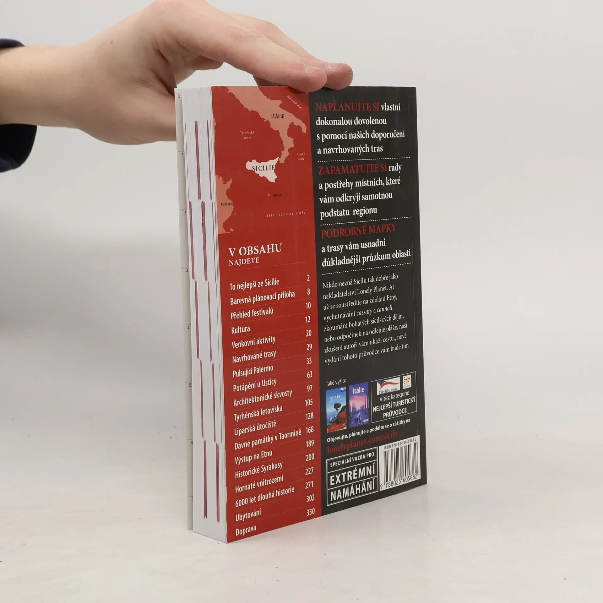 Podrobný průvodce z řady Lonely Planet uvádí fakta o jednotlivých částech Sicílie s navrhovanými trasami a informacemi o ubytování, stravování a zábavě. Cestovní příručka obsahuje praktické rady a údaje pro turisty, popisy míst, krajiny a pamětihodností i pojednání o historii a kultuře ostrova jižního Středomoří.