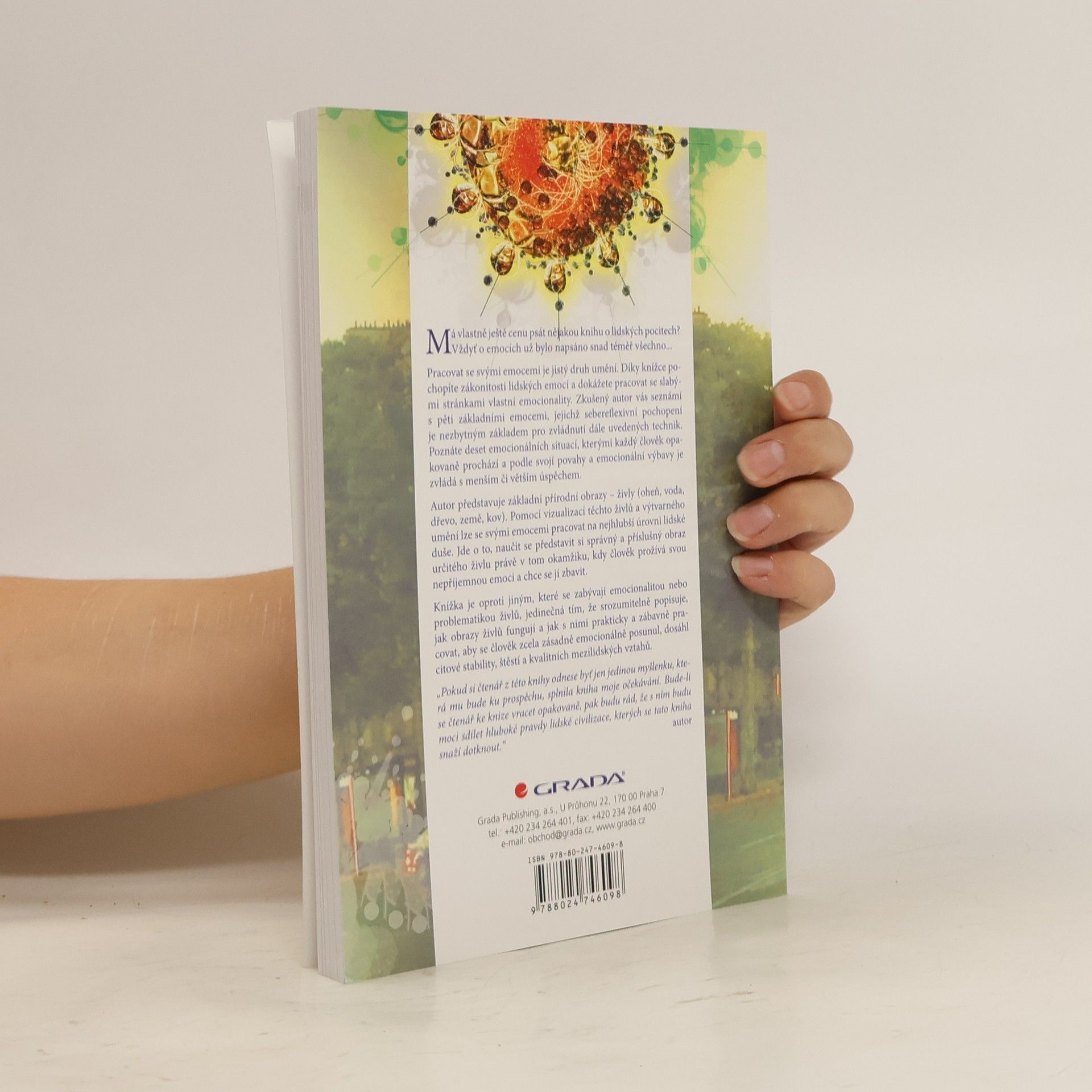 Má ještě cenu psát o lidských pocitech? O emocích bylo napsáno téměř vše, ale práce se svými emocemi je umění. Kniha přináší pochopení zákonitostí lidských emocí a pomáhá pracovat se slabými stránkami vlastní emocionality. Autor seznámí čtenáře s pěti základními emocemi, jejichž sebereflexivní pochopení je klíčové pro zvládnutí technik, které následují. Dále představuje deset emocionálních situací, kterými každý prochází a které zvládá podle své povahy a emocionální výbavy. Základní přírodní obrazy – živly (oheň, voda, dřevo, země, kov) – slouží jako nástroje pro práci s emocemi na hluboké úrovni. Vizualizace těchto živlů pomáhá představit si správný obraz v okamžiku prožívání nepříjemné emoce, což usnadňuje její překonání. Kniha se odlišuje od jiných tím, že srozumitelně popisuje, jak obrazy živlů fungují a jak s nimi prakticky a zábavně pracovat, aby čtenář dosáhl emocionálního posunu, stability, štěstí a kvalitních mezilidských vztahů. Autor doufá, že čtenář si odnese alespoň jednu užitečnou myšlenku a bude se k textu vracet pro hluboké pravdy lidské civilizace.