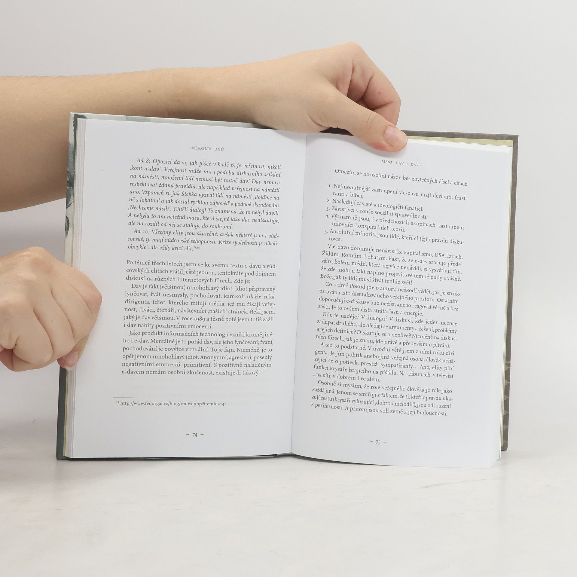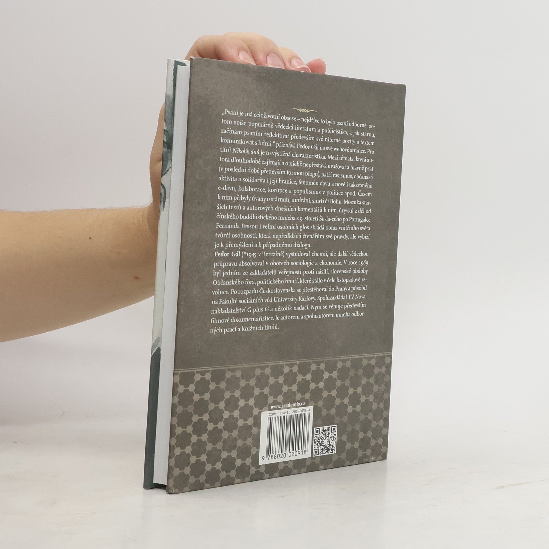 „Psaní je má celoživotní obsese – nejdříve to bylo psaní odborné, potom spíše populárně-vědecká literatura a publicistika, a jak stárnu, začínám psaním reflektovat především své niterné pocity a textem komunikovat s lidmi,“ přiznává Fedor Gál na své webové stránce. Pro titul Několik dnů je to výstižná charakteristika. Mezi témata, která autora dlouhodobě zajímají a o nichž nepřestává uvažovat a hlavně psát (v poslední době především formou blogu), patří rasismus, občanská aktivita a solidarita i její hranice, fenomén davu a nově i takzvaného e-davu, kolaborace, korupce a populismus v politice apod. Časem k nim přibyly úvahy o stárnutí, umírání, smrti či Bohu. Mozaika starších textů a autorových dnešních komentářů k nim, úryvků z děl od čínského buddhistického mnicha z 9. století Šu-la-ceho po Portugalce Fernanda Pessou i velmi osobních glos skládá obraz vnitřního světa tvůrčí osobnosti, která nepředkládá čtenářům své pravdy, ale vybízí je k přemýšlení a k případnému dialogu.