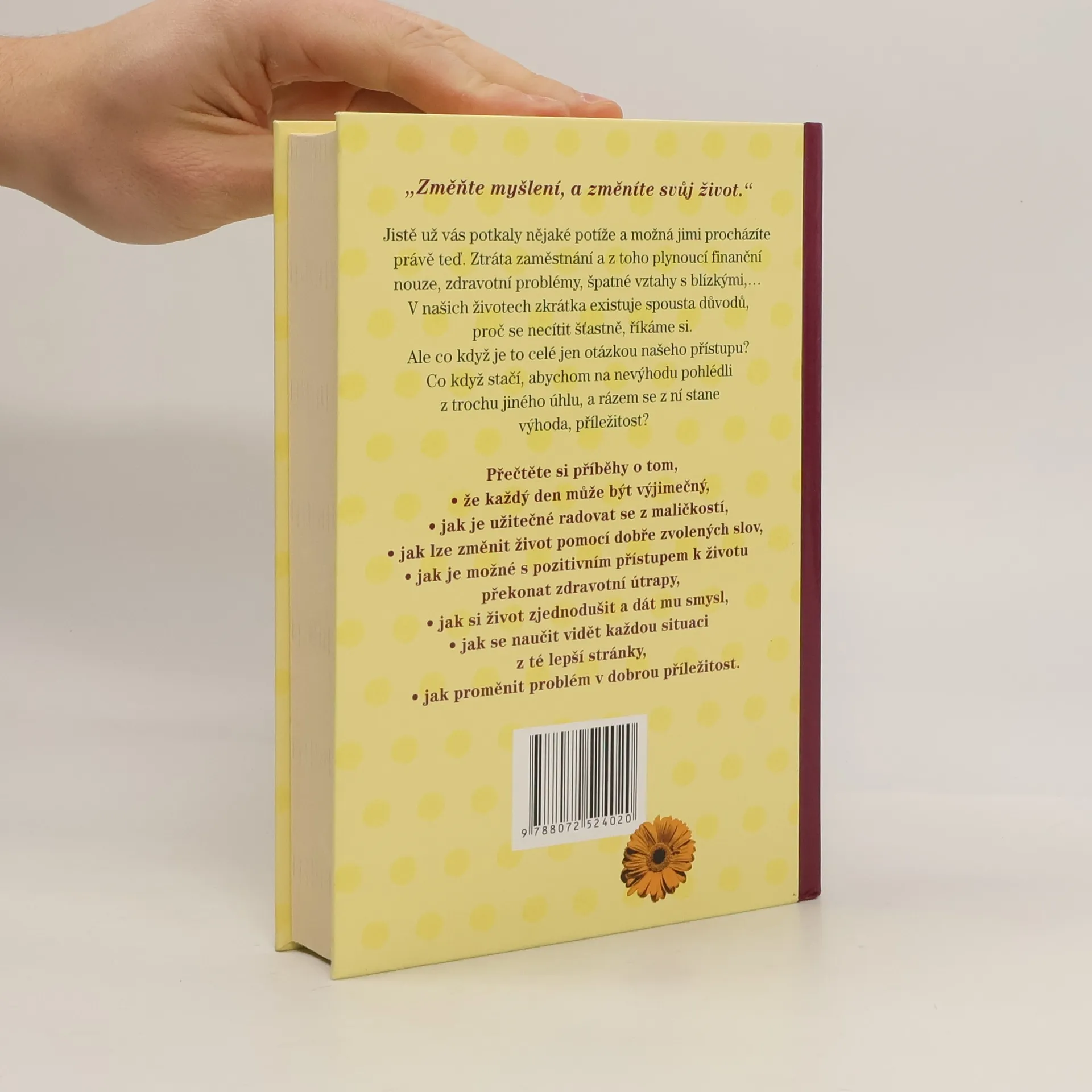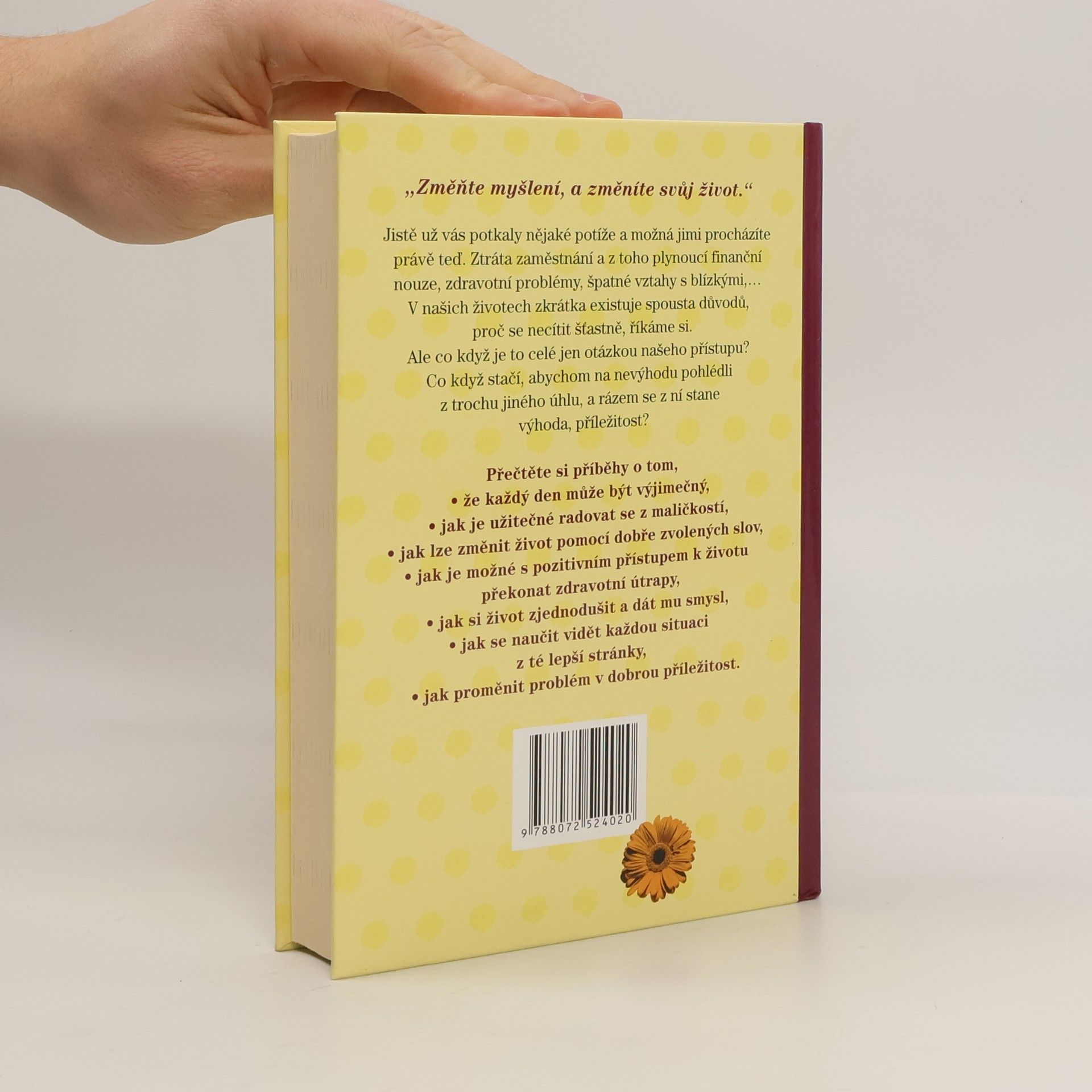 Jistě už vás potkaly nějaké potíže a možná jimi procházíte právě teď. Ztráta zaměstnání a z toho plynoucí finanční nouze, zdravotní problémy, špatné vztahy s blízkými,… V našich životech zkrátka existuje spousta důvodů, proč se necítit šťastně, říkáme si. Ale co když je to celé jen otázkou našeho přístupu? Co když stačí, abychom na nevýhodu pohlédli z trochu jiného úhlu, a rázem se z ní stane výhoda, příležitost? Přečtěte si příběhy o tom: - že každý den může být výjimečný, - jak je užitečné radovat se z maličkostí, - jak lze změnit život pomocí dobře zvolených slov, - jak je možné s pozitivním přístupem k životu překonat zdravotní útrapy, - jak si život zjednodušit a dát mu smysl, - jak se naučit vidět každou situaci z té lepší stránky, - jak proměnit problém v dobrou příležitost.