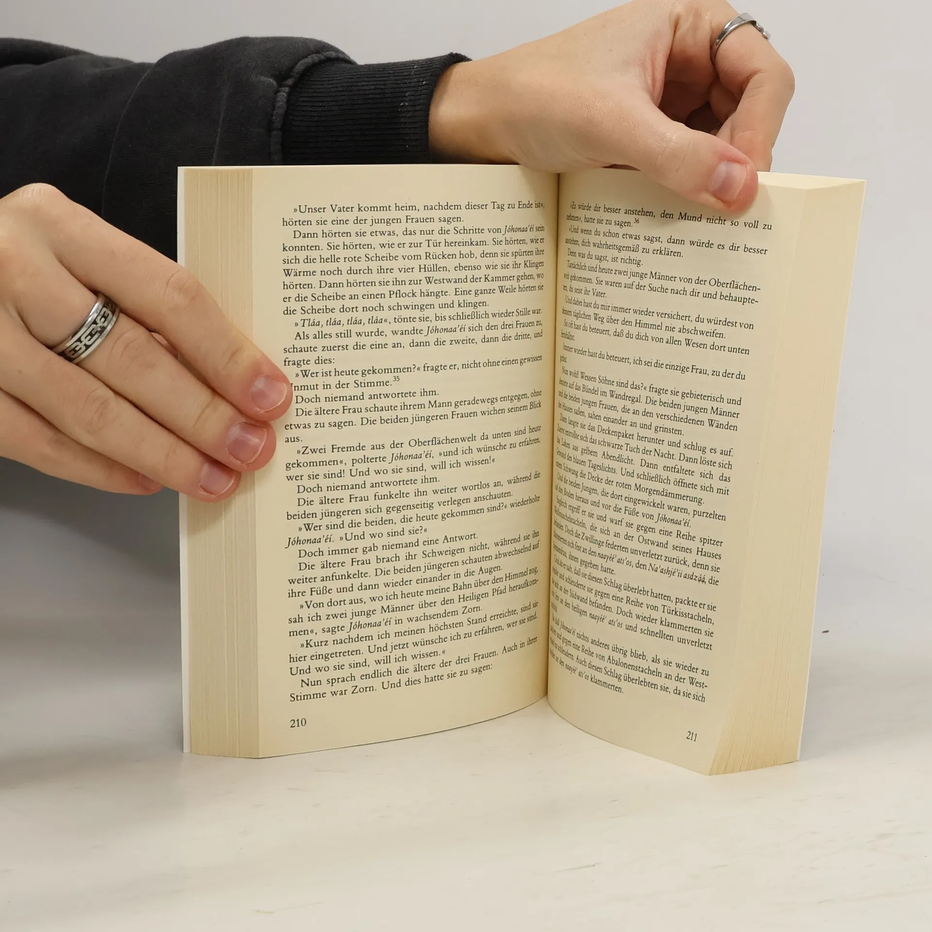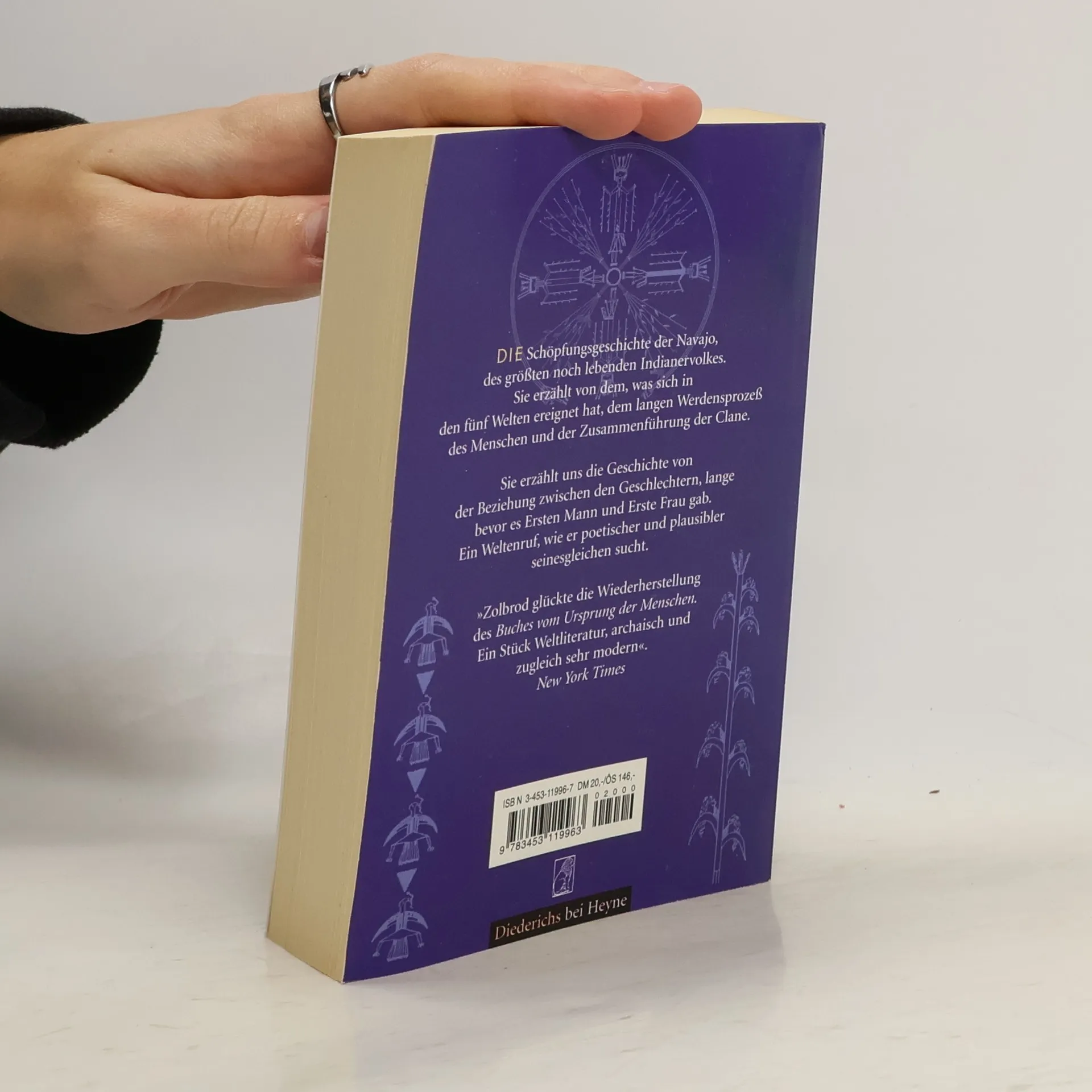 Die Navajo sind das größte noch existierende Indianervolk Nordamerikas. Die Schöpfungsgeschichte ihrer Kultur erzählt von dem, was sich in den „Fünf Welten“ ereignet hat, dem langen Werdensprozeß des Menschen und der Zusammenführung der Clans. Sie erzählt uns die Geschichte von der Beziehung zwischen den Geschlechtern, lange bevor es „Ersten Mann“ und „Erste Frau“ gab. Ein Weltenruf voller Anmut und Poesie. „Ein Stück Weltliteratur, archaisch und zugleich sehr modern.“ New York Times