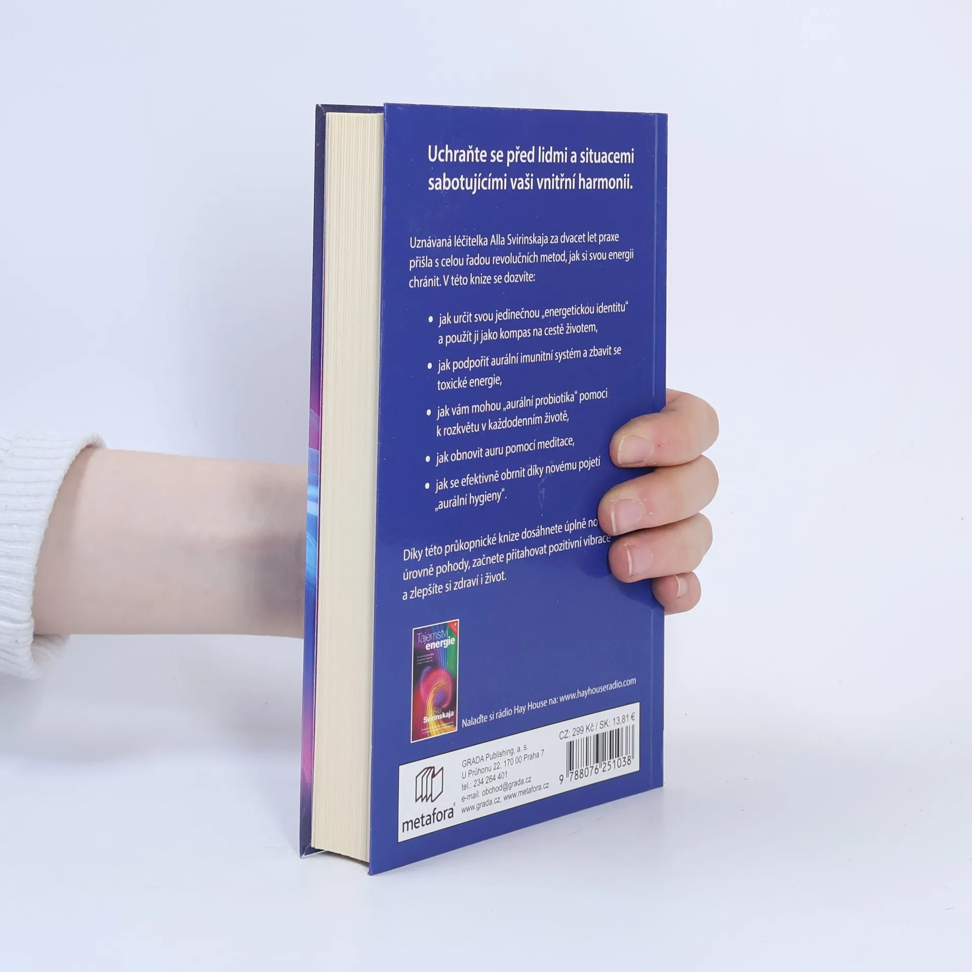 Uchraňte se před lidmi a situacemi sabotujícími vaši vnitřní harmonii. Energie je důležitá část vašeho já, stejně unikátní jako otisky prstů. Když nejste v souladu se svou podstatou, přitahujete negativní energii a stáváte se kořistí energetických upírů (nebo přímo jedním z nich). Když ale o svou energii pečujete, dovedete ovlivnit své vibrace, negativitu odrazit a stát se nejlepší verzí sebe sama. Uznávaná léčitelka Alla Svirinskaja za 20 let praxe přišla s celou řadou revolučních metod, jak si svou energii chránit. V této knize se dozvíte: • jak určit svou jedinečnou „energetickou identitu“ a použít ji jako kompas na cestě životem • jak podpořit aurální imunitní systém a zbavit se toxické energie • jak vám mohou „aurální probiotika“ pomoci k rozkvětu v každodenním životě • jak obnovit auru pomocí meditace • jak se efektivně obrnit díky novému pojetí „aurální hygieny“ Díky této průkopnické knize dosáhnete úplně nové úrovně pohody, začnete přitahovat pozitivní vibrace a zlepšíte si zdraví i život.
