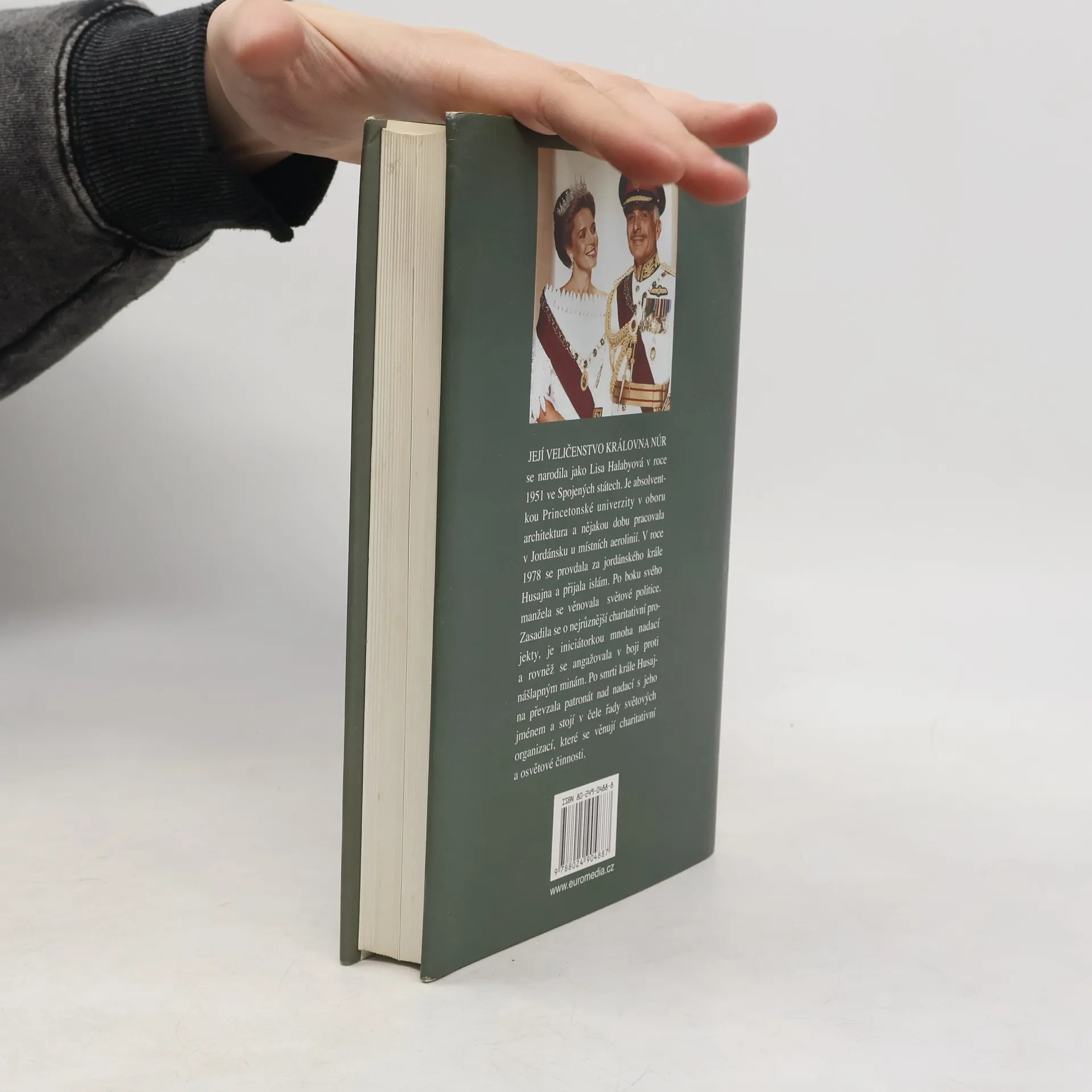 Její Veličenstvo královna Núr se narodila v r. 1951 v USA jako Lisa Halabyová. Je absolventkou Princetonské univerzity, nějakou dobu pracovala v Jordánsku u místních aerolinií.Tam se seznámila s jordánským králem Husajnem; setkání vedlo k téměř románovému vyústění: neznámá emancipovaná Američanka se v r. 1978 stala jordánskou královnou Núr al-Husajní a postupně matkou jeho čtyř dětí. Po boku manžela se věnovala světové politice, zasadila se za charitativní projekty, angažovala se v boji proti nášlapným minám. Po smrti krále převzala patronát nad nadací s jeho jménem a stojí v čele řady světových charitativních organizací. Ve svých pamětech se smyslem pro humor popisuje, jak musela překážky, které před ni kladlo nové společenské postavení. Její memoáry dávají nahlédnout do střeženého soukromí královské rodiny a přinášejí jedinečný portrét tohoto monarchy. Zároveň ukazují mentalitu arabského světa a dokumentují, jak stále víc narůstá neporozumění mezi USA a arabským světem.