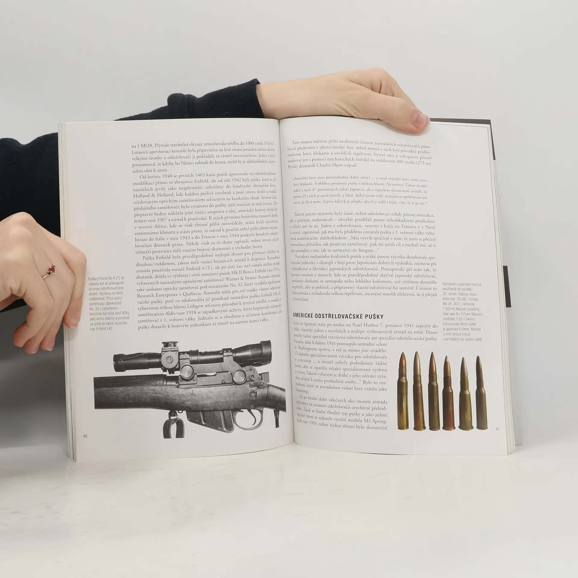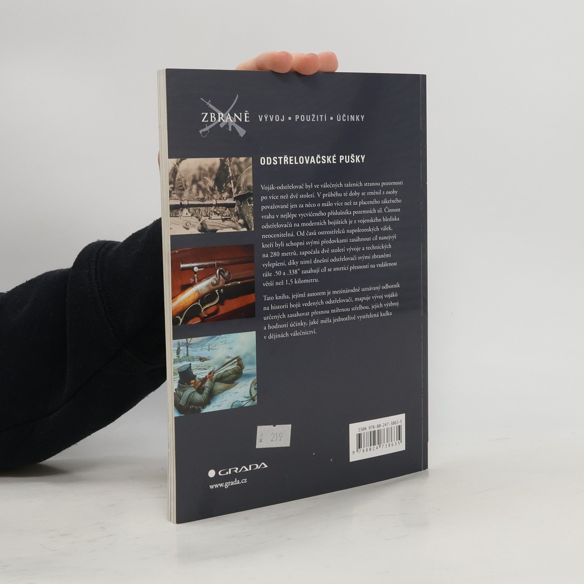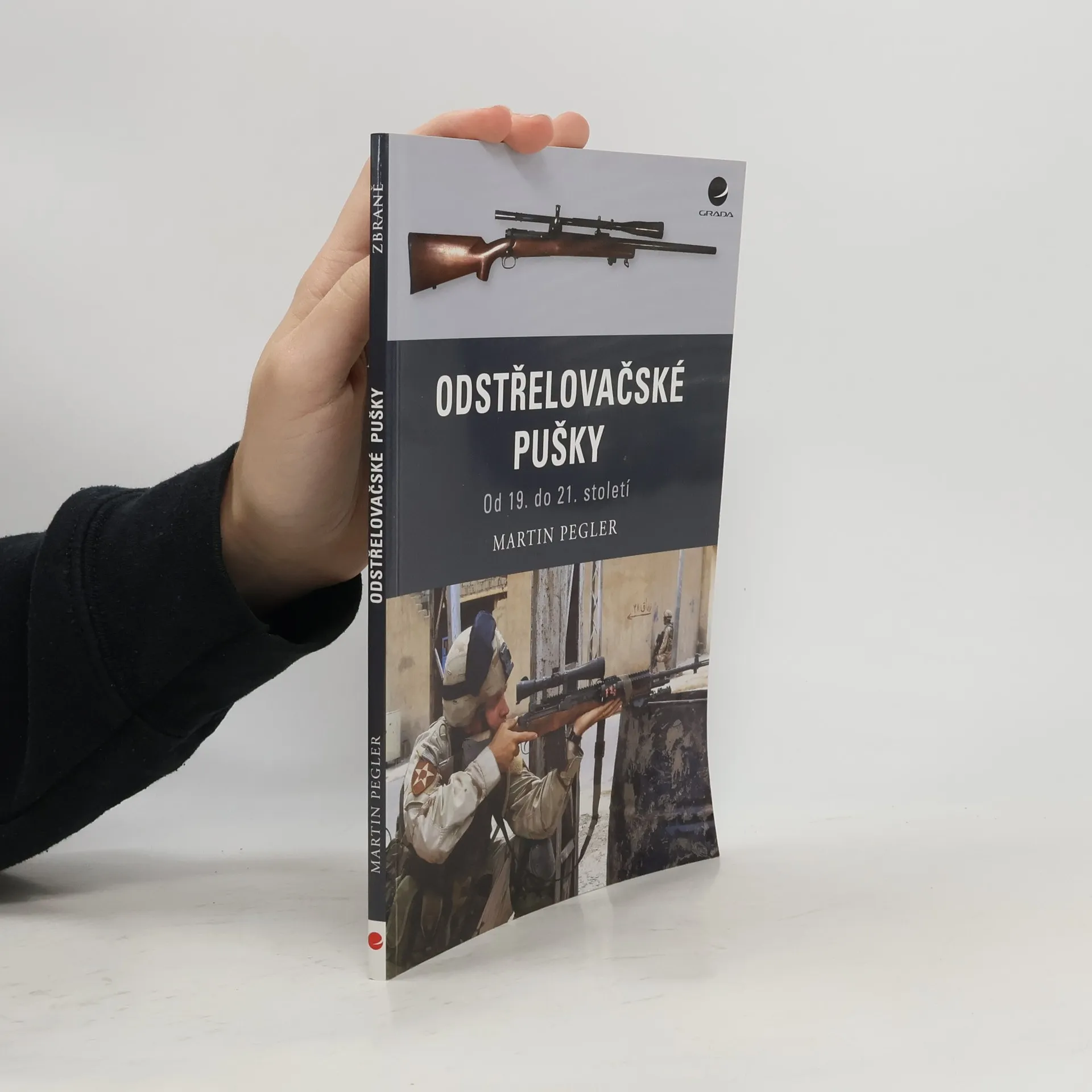 První svazek nové edice Zbraně se zabývá velice atraktivním tématem, odstřelovačskými puškami a úlohou odstřelovače neboli snipera v armádě. Jejím autorem je mezinárodně uznávaný odborník na historii bojů vedených odstřelovači. Zahrnuje technický popis odstřelovačské pušky od jejího uvedení do vojenské služby za napoleonských válek, přes občanskou válku v USA až po její vrcholné a velice časté nasazování v Iráku a Afghánistánu. V knize je podrobně vylíčen vývoj v používání střeliva, různé typy zbraní včetně jednoranných, samonabíjecích a poloautomatických, zavedení a užívání optických mířidel i současné pokusy o progresivní technologie, laserové dálkoměry, zaměřovací dalekohledy a noktovizní zaměřovače. S použitím bezprostředních zkušeností autor představuje nebezpečný svět patřící neoddělitelně k životu sniperů, odkrývá způsob jejich výcviku a maskovací techniky.