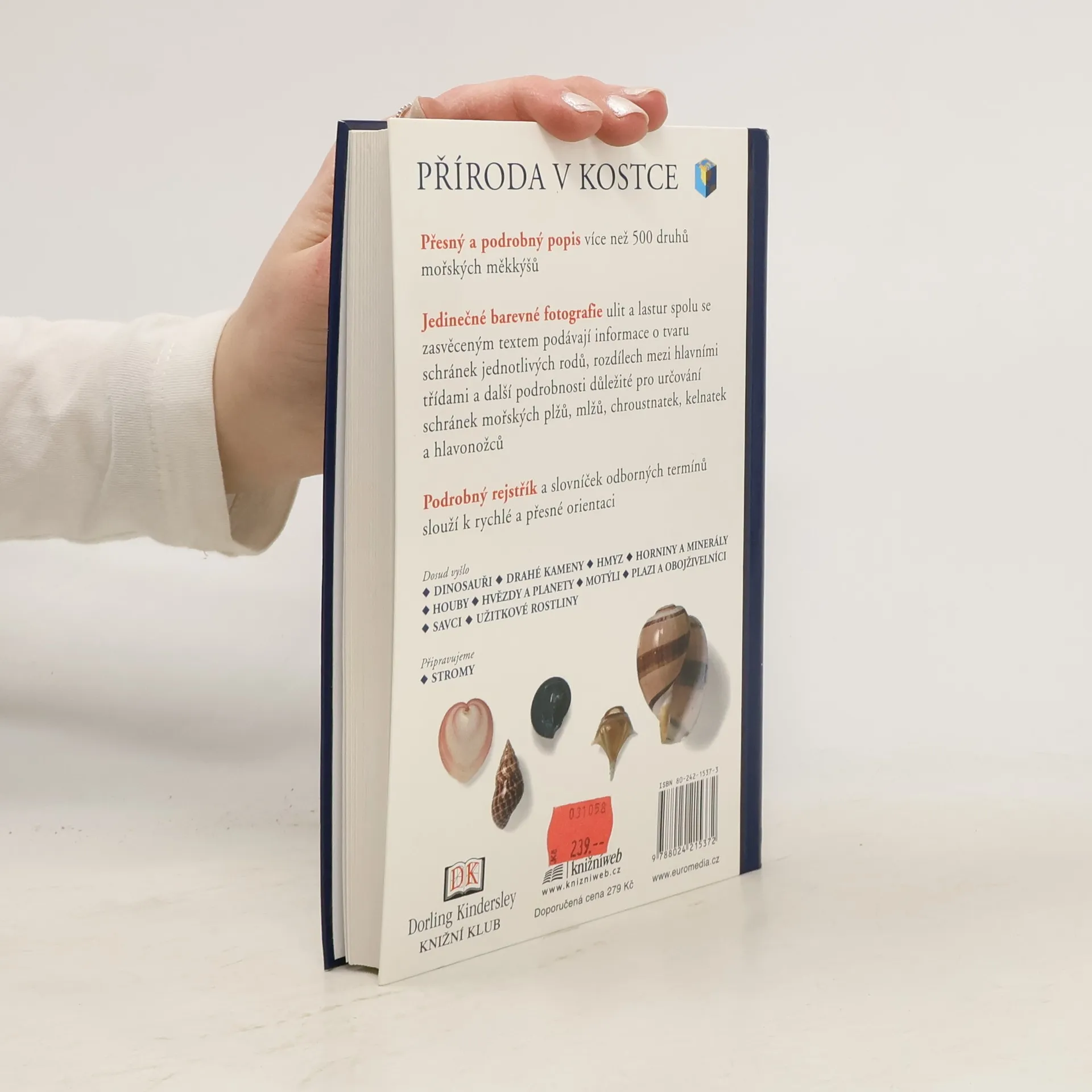 Příroda v kostce Přesný a podrobný popis více než 500 druhů mořských měkkýšů Jediněčné barevné fotografie ulit a lastur spolu se zasvěceným textem podávají informace o tvaru schránek jednotlivých rodů, rozdílech mezi hlavními třídami a další podrobnosti důležité pro určování schránek mořských plžů, mlžů, chroustnatek, kelnatek a hlavonožců Podrobný rejstřík a slovníček odborných termínů slouží k rychlé a přesné orientaci