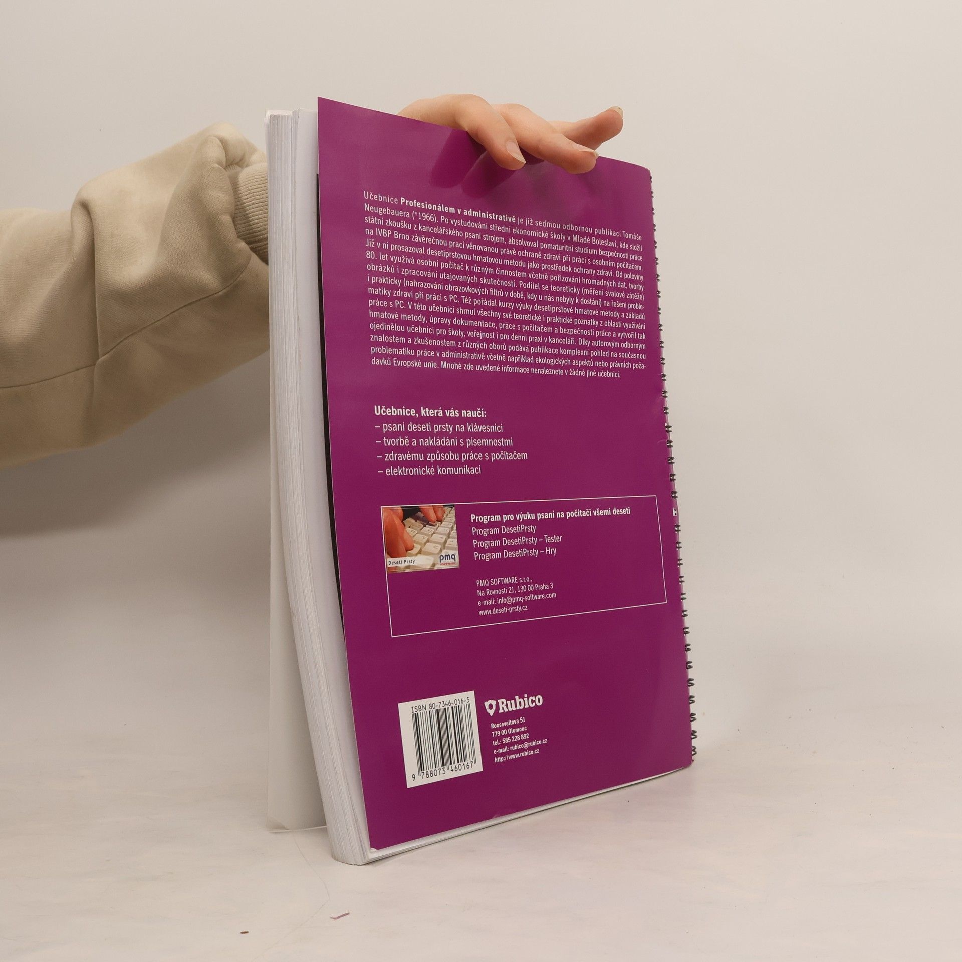 V této učebnici shrnul autor všechny své teoretické i praktické poznatky z oblastí využívání hmatové metody, úpravy dokumentace, práce s počítačem a bezpečnosti práce a vytvořil tak ojedinělou učebnici pro školy, veřejnost i pro denní praxi v kanceláři. Díky autorovým odborným znalostem a zkušenostem z různých oborů podává publikace komplexní pohled na současnou problematiku práce v administrativě včetně například ekologických aspektů nebo právních požadavků Evropské unie. Mnohé zde uvedené informace nenaleznete v žádné jiné učebnici. Učebnice, která vás naučí: - psaní deseti prsty na klávesnici - tvorbě a nakládání s písemnostmi - zdravému způsobu práce s počítačem - elektronické komunikaci