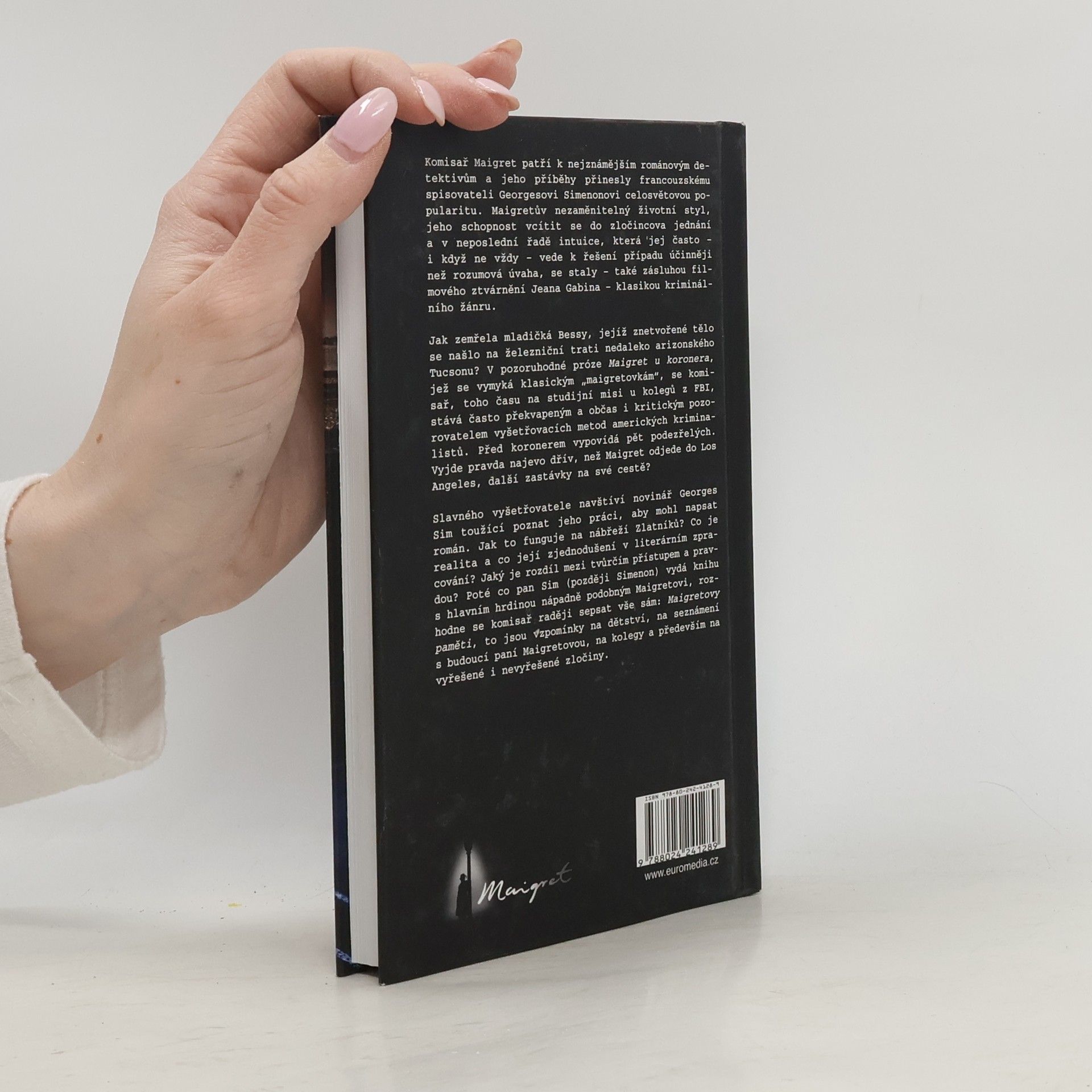 Maigret u koronera – Jak zemřela mladičká Bessy, jejíž znetvořené tělo se našlo na železniční trati nedaleko arizonského Tucsonu? Maigret, toho času na studijní misi u kolegů z FBI, se v této pozoruhodné próze, jež se vymyká klasickým „maigretovkám“, stává často překvapeným a občas i kritickým pozorovatelem vyšetřovacích metod amerických kriminalistů. Před koronerem vypovídá pět podezřelých. Vyjde pravda najevo dřív, než Maigret odjede do Los Angeles, další zastávky na jeho cestě? Maigretovy paměti – Slavného vyšetřovatele navštíví novinář Georges Sim toužící poznat jeho práci, aby mohl napsat román. Jak to funguje na nábřeží Zlatníků? Co je realita a co její zjednodušení v literárním zpracování? Jaký je rozdíl mezi tvůrčím přístupem a pravdou? Poté co Georges Sim (později Simenon) vydá knihu s hlavním hrdinou nápadně podobným Maigretovi, rozhodne se komisař raději sepsat své paměti sám: vzpomínky na dětství, na seznámení s budoucí paní Maigretovou, na své kolegy a především na vyřešené i nevyřešené zločiny.