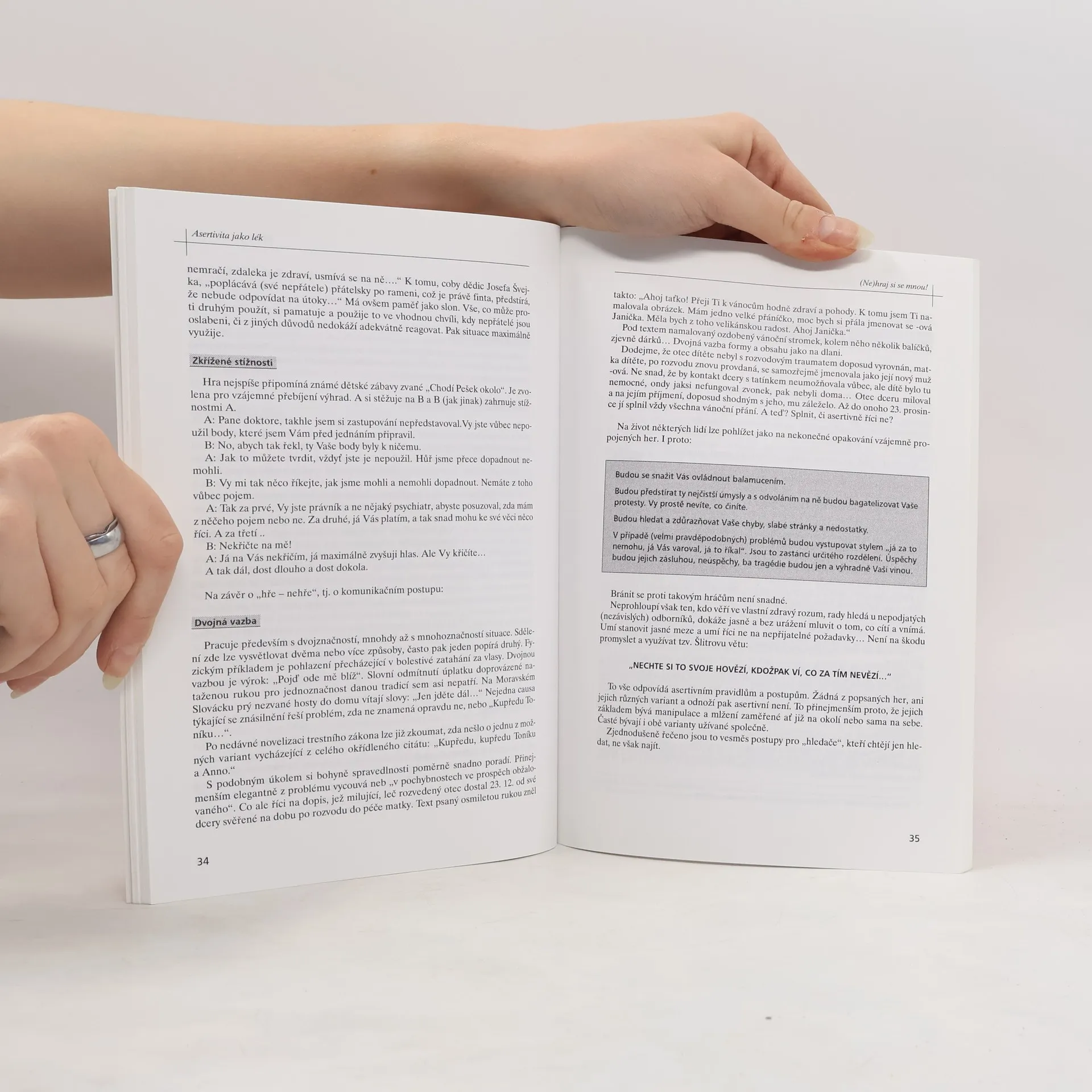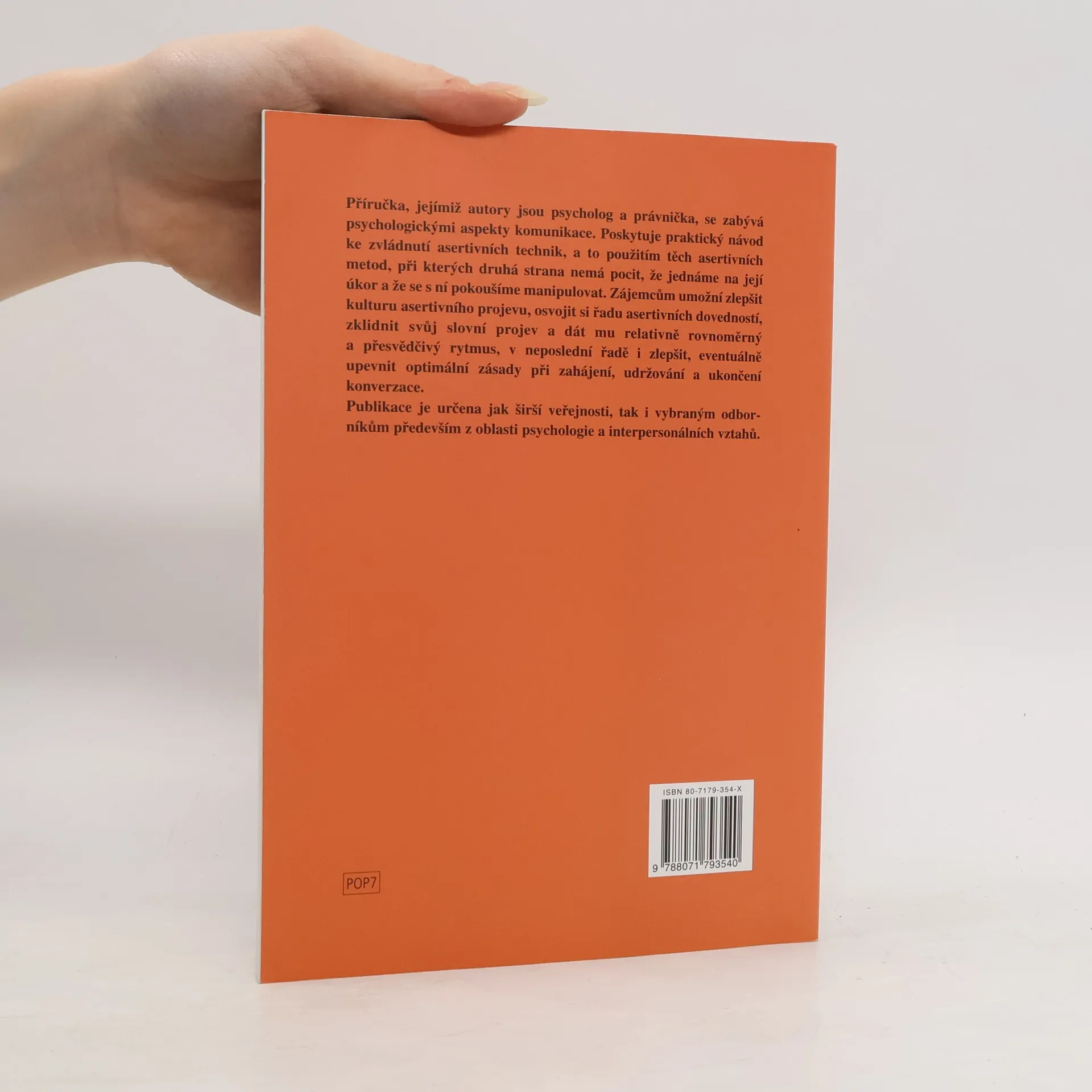 Příručka dvojice autorů - psychologa a právničky - poskytuje praktické návody na zvládnutí asertivních technik při komunikaci s druhými lidmi. Tentokrát se nejedná ani tak o uplatnění asertivity v partnerském či rodinném soužití, ale spíše o využívání vhodných asertivních metod v profesních vztazích, např. při jednání na úřadech. I když základní rady a principy jsou samozřejmě podávány v obecné rovině, takže se dají aplikovat kdekoliv a kdykoliv. Autoři se snaží ukázat asertivitu v nezkreslené podobě - tedy ne jako agresivitu, sebeprosazování za každou cenu či manipulaci, jak bývá často špatně chápáno a bohužel i leckdy doporučováno, ale jako určitou komunikační dovednost, která umožňuje navázat lepší vztahy s druhými lidmi a dodá nám i určitou sebejistotu, spokojenost se sebou sama (dokážeme-li vyjádřit svoje názory, jsme-li schopni sdělit, co chceme či nechceme, zvládneme-li konverzaci, přestože nejde o zrovna příjemnou záležitost).