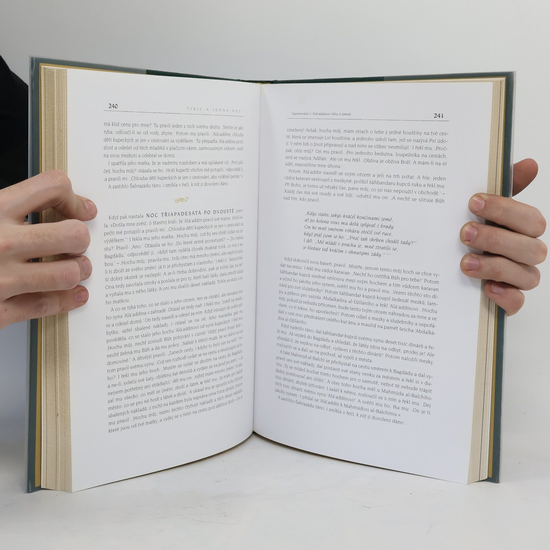 3. kniha z osmi. Sbírka Tisíce a jedné noci se stala součástí zlatého fondu světové literatury. Toto výjimečné dílo inspirovalo přední světové literáty a mělo velký vliv na evropskou uměleckou tvorbu. Od vydání prvního překladu do evropského jazyka uplynulo již 300 let! Ojedinělé dílo vzbuzuje dodnes pozornost bohatstvím a důmyslností příběhů, exotickým koloritem, vtipem a kresbou nevšedního prostředí, znaky, které jim vtiskli vypravěči, aby stejně jako Šahrazád zaujali posluchače. Výběr námětů je široký, od krátkých anekdot po legendy, které prostým posluchačům dávaly naději, že na každého někde čeká bohatství a štěstí. Toto je luxusní, plně ilustrované, v hedvábí vázané vydání se zlatou ořízkou v uznávaném překladu prof. Felixe Tauera, s bohatým poznámkovým aparátem. http://1000ajednanoc.cz/ ISBN pro soubor: 978-80-207-1343-8