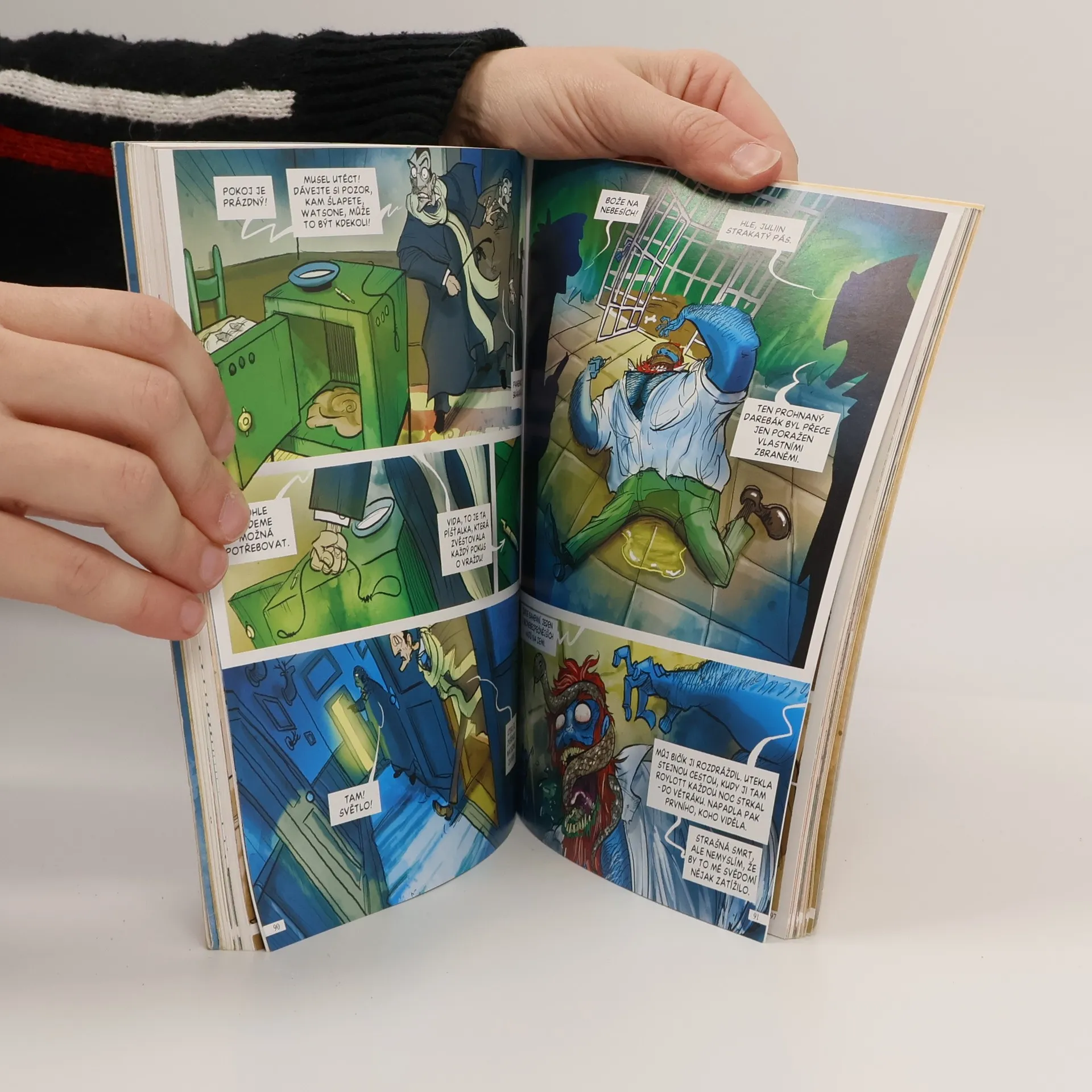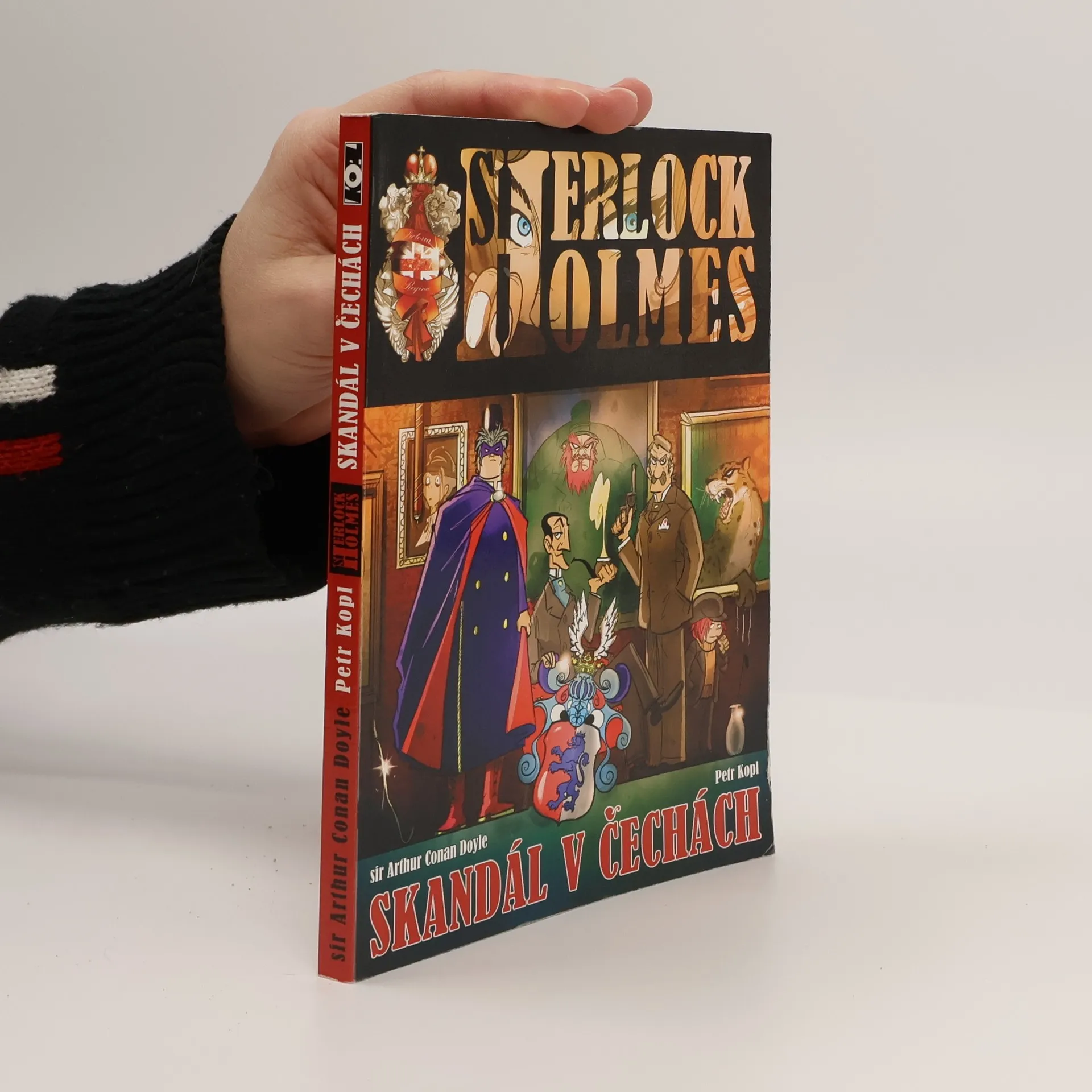 Detektiv Sherlock Holmes řeší skandál v Čechách. Na rozdíl od dnešních dnů vše brilantně vyřeší. Podobně jako v předchozí knize Poslední případ, i v této komiksové adaptaci řeší Sherlock Holmes několik případů, které se v podání Petra Kopla vzájemně proplétají. Název prvního z nich – Skandál v Čechách – dal jméno i celé knize. Druhý příběh – Strakatý pás – přivádí Sherlocka Holmese i dr. Watsona na anglický venkov, kde není nouze o nejrůznější překvapení. Petr Kopl zachází s předlohou volně, ale drží se jádra příběhu, a pokud někde něco přidá, otevírá si tím dvířka do světa dalších mystifikací; stále však zůstává v době končícího 19. a začínajícího 20. století, kterou nazývá Victoria Regina. Pro zajímavost: na straně 7 naleznete v knize časovou osu, na které je chronologicky uveden přehled dosud zpracovaných příběhů.