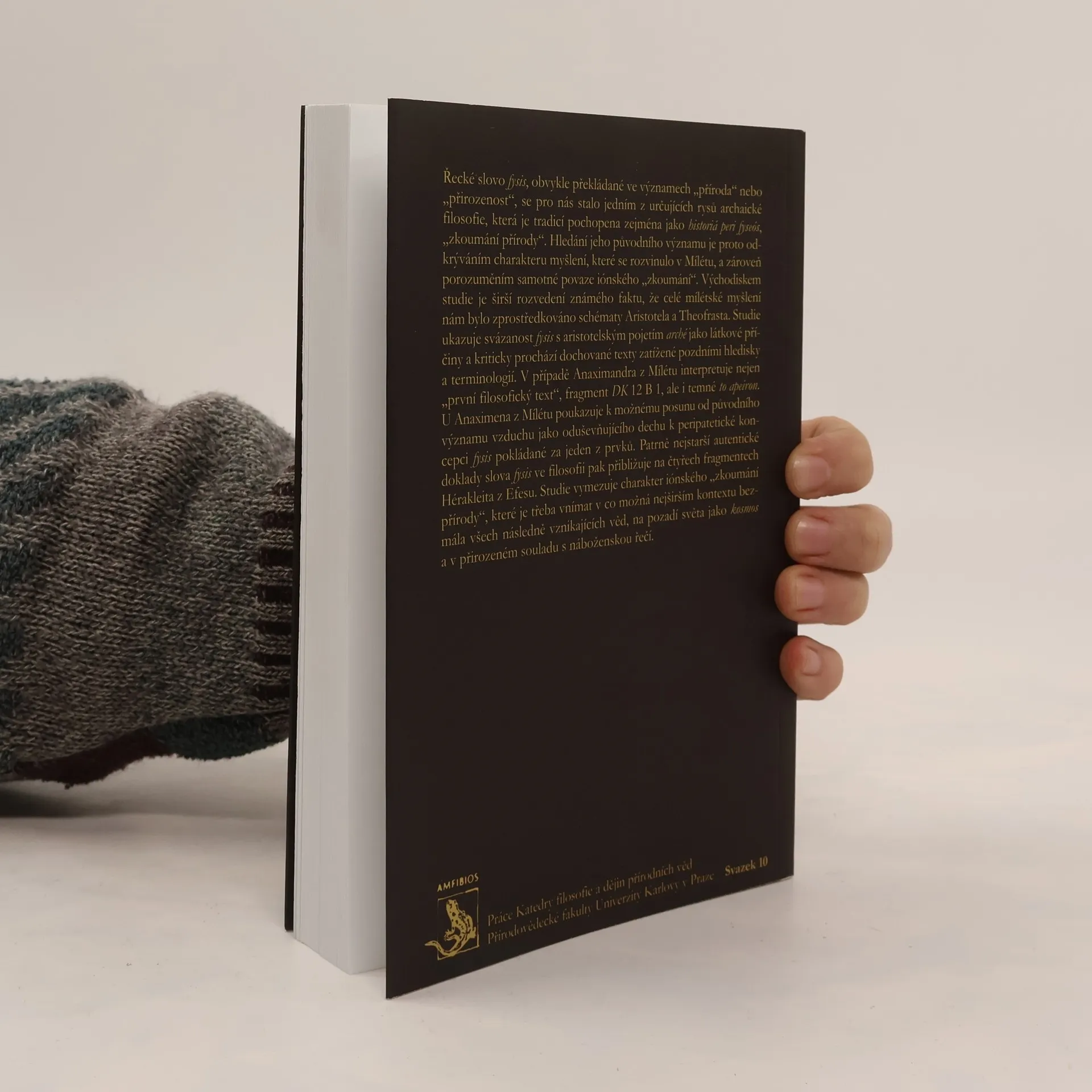Řecké slovo fysis, obvykle překládané ve významech „příroda“ nebo „přirozenost“, se pro nás stalo jedním z určujících rysů archaické filosofie, která je tradicí pochopena zejména jako „zkoumání přírody“. Hledání jeho původního významu je proto odkrýváním charakteru myšlení, které se rozvinulo v Mílétu, a zároveň porozuměním samotné povaze iónského „zkoumání“. Východiskem studie je širší rozvedení známého faktu, že celé mílétské myšlení nám bylo zprostředkováno schématy Aristotela a Theofrasta. Dále ukazuje svázanost fysis s aristotelským pojetím arché jako látkové příčiny a kriticky prochází dochované texty zatížené pozdními hledisky a terminologií. Vymezuje také charakter iónského „zkoumání přírody“, které je třeba vnímat v co možná nejširším kontextu bezmála všech následně vznikajících věd, na pozadí světa jako kosmos a v přirozeném souladu s náboženskou řečí.