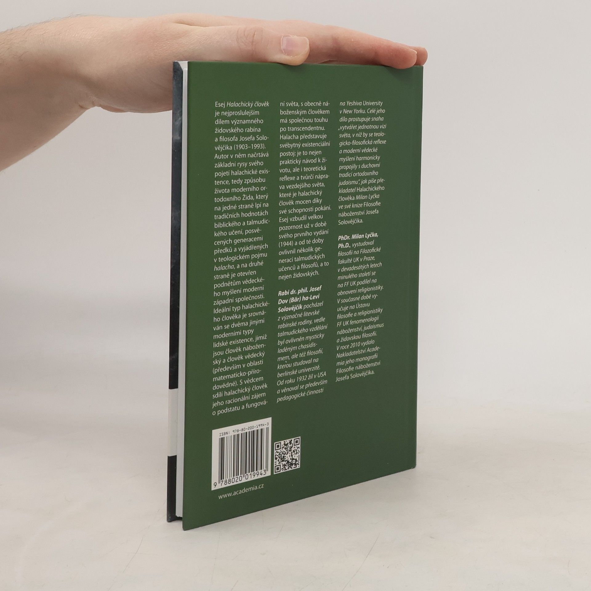 Esej Halachický člověk je nejproslulejším dílem významného židovského rabína a filosofa Josefa Solovějčika (1903-1993). Autor v něm načrtává základní rysy svého pojetí halachické existence, tedy způsobu života moderního ortodoxního Žida, který na jedné straně lpí na tradičních hodnotách biblického a talmudického učení, posvěcených generacemi předků a vyjádřených v teologickém pojmu halacIš ha-halacha-galuj ve-nistara, a na druhé straně je otevřen podnětům vědeckého myšlení moderní západní společnosti. Ideální typ halachického člověka je srovnáván se dvěma jinými moderními typy lidské existence, kterými jsou člověk náboženský a člověk vědecký (matematický přírodovědec). S vědcem halachický člověk sdílí jeho racionální zájem o podstatu a fungování světa, s obecně náboženským člověkem má společnou touhu po transcendentnu. Halacha představuje svébytný existenciální postoj: je to nejen praktický návod k životu, ale i teoretická reflexe a tvůrčí náprava vezdejšího světa, které je halachický člověk mocen díky své schopnosti pokání. Esej vzbudil velkou pozornost už v době svého prvního vydání (1944) a od té doby ovlivnil několik generací talmudických učenců a filosofů, a to nejen židovských. Vychází v edici Judaica.