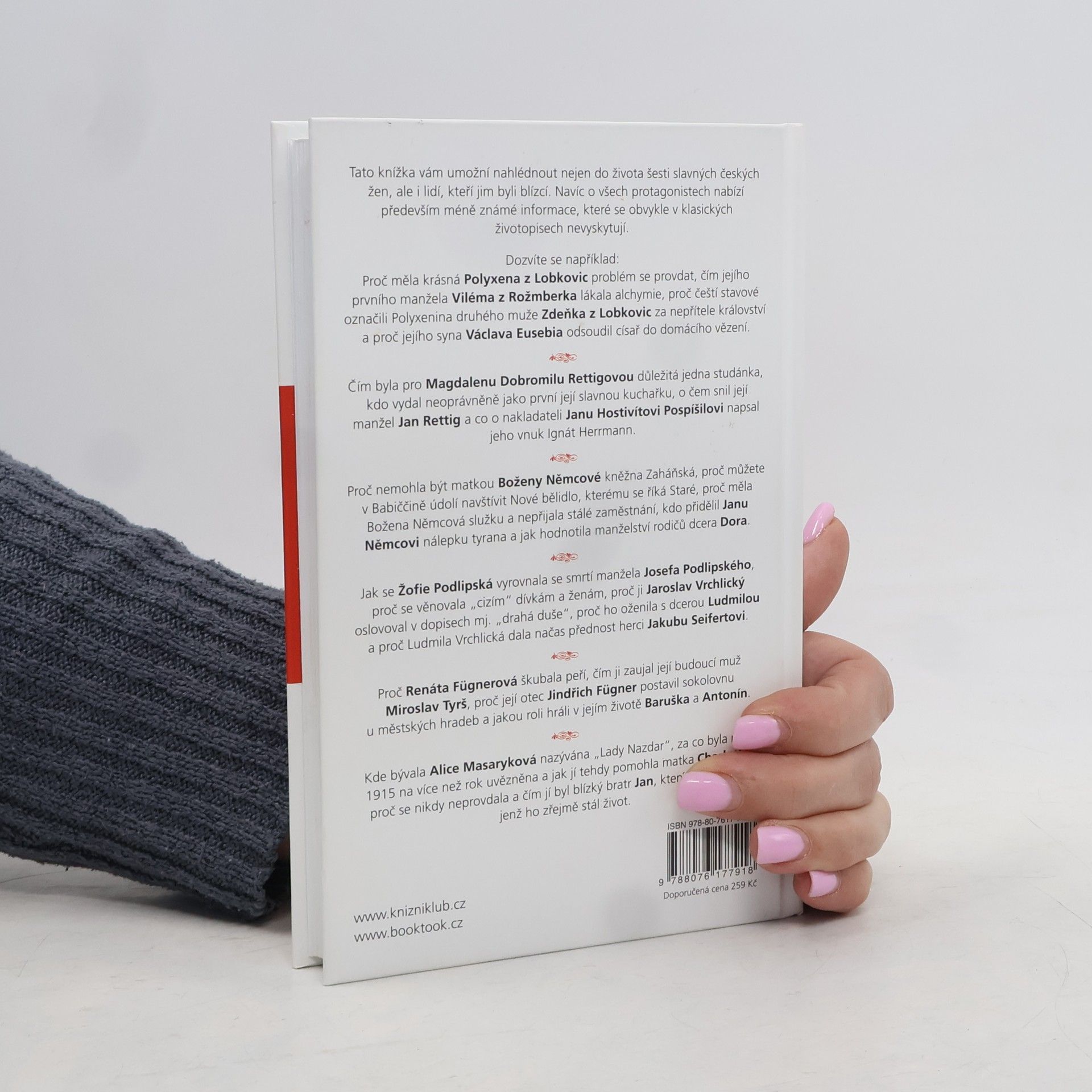 Tato kniha nabízí setkání se šesti slavnými českými ženami, jejichž jména sice znáte a víte, čím zasáhly do historie našeho národa, ale autorka o nich v tomto titulu nabízí řadu méně známých zajímavých informací, které se týkají především jejich osobního, citového života a partnerů, příbuzných i přátel, které měly nejraději. Ze zcela jiného úhlu se zde představí Polyxena z Lobkovic, Magdalena Dobromila Rettigová, Božena Němcová, Sofie Podlipská, Renáta Tyršová a Alice Masaryková, odhalí nám své lidské stránky a seznámíme se s lidmi, k nimž měly tyto známé osobnosti v životě nejblíže.