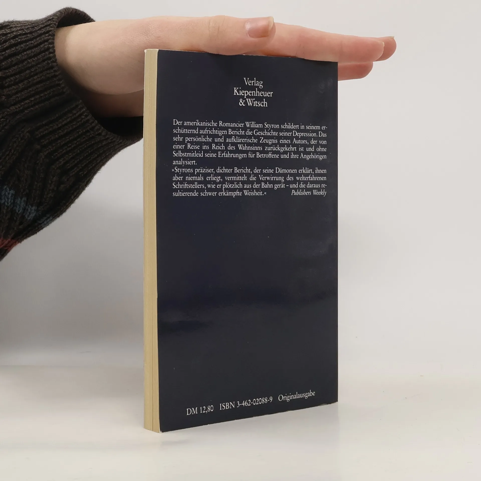 „Ich habe bis an die Grenzen des Erträglichen unter der Krankheit gelitten und bin doch zurückgekommen, um davon zu berichten.“ William Styron schreibt mit großer Aufrichtigkeit über seinen Kampf gegen die Depression, eine Krankheit, die noch immer kaum verstanden wird und mit vielen Tabus belegt ist. Ganz ohne Selbstmitleid erzählt er dabei von der „grimmigen Innerlichkeit des Schmerzes“, von Angstzuständen, Selbstmordgedanken und der Unfähigkeit, sich seiner Umwelt mitzuteilen. Nach einer langen Zeit des Leidens findet er schließlich im Rückblick Worte für ein Leben am Rande des Wahnsinns und gibt so auch denen eine Stimme, für die das Grauen der Depression unausdrückbar ist.