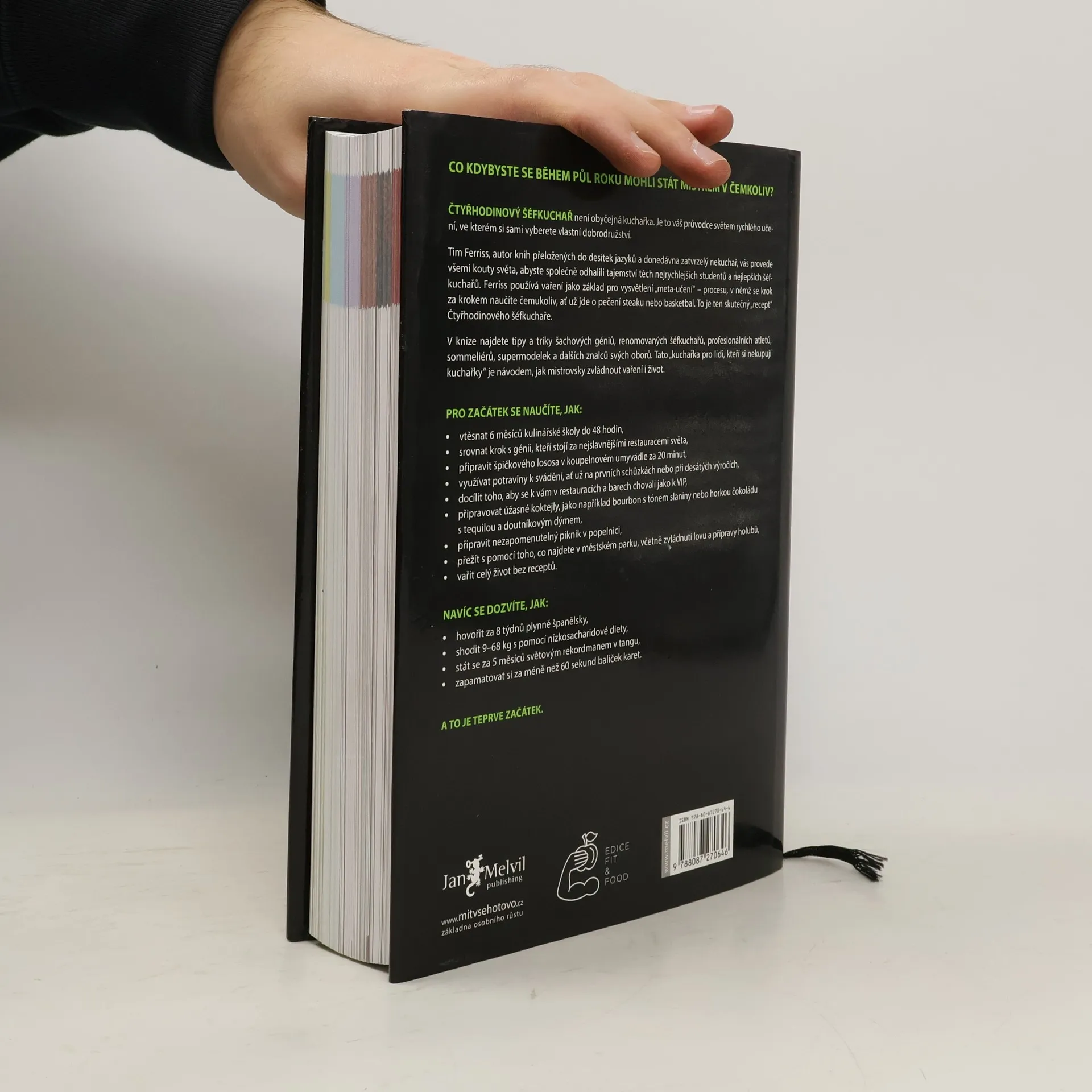 Timothy Ferriss přichází se svou dlouho připravovanou a napjatě očekávanou kuchařkou pro ty, kteří si kuchařky nikdy nekupují. Jeho přímočará cesta k cíli, známá již z předchozích bestsellerů Čtyřhodinový pracovní týden a Čtyřhodinové tělo vede v této vynalézavé knize přes všechny apekty života. Protože jak říká Tim, pokud se chcete naučit vařit, musíte se nejprve naučit učit se. Jakmile umíte tohle, můžete se naučit vařit, mluvit cizí řečí, hrát baketball, přežít v divočině… prostě stát se světovou třídou, v čem budete chtít. S Timem v roli šéfkuchaře projdete školou vaření, v níž se s každým receptem naučíte určitou dovednost, kterou následně využijete v dalším receptu. Množství tipů a triků z vás udělá vládce kuchyně, ale Ferriss, jak už má ve zvyku, se neomezuje jen na vaření doma. V části o divočině si uloví večeři, ve vědecké části pochopí molekulární kuchyni…