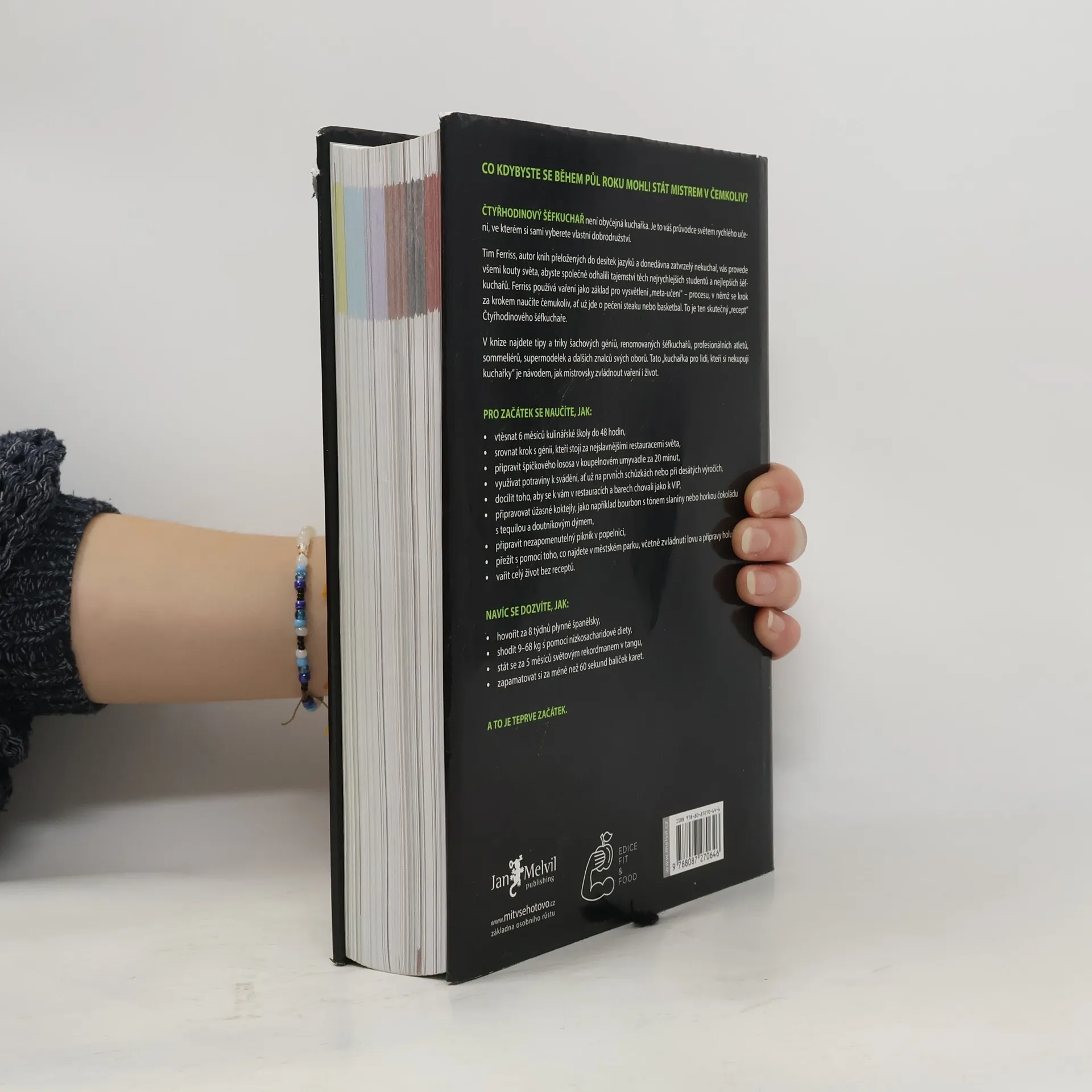 Timothy Ferriss přichází se svou dlouho připravovanou a napjatě očekávanou kuchařkou pro ty, kteří si kuchařky nikdy nekupují. Jeho přímočará cesta k cíli, známá již z předchozích bestsellerů Čtyřhodinový pracovní týden a Čtyřhodinové tělo vede v této vynalézavé knize přes všechny apekty života. Protože jak říká Tim, pokud se chcete naučit vařit, musíte se nejprve naučit učit se. Jakmile umíte tohle, můžete se naučit vařit, mluvit cizí řečí, hrát baketball, přežít v divočině… prostě stát se světovou třídou, v čem budete chtít. S Timem v roli šéfkuchaře projdete školou vaření, v níž se s každým receptem naučíte určitou dovednost, kterou následně využijete v dalším receptu. Množství tipů a triků z vás udělá vládce kuchyně, ale Ferriss, jak už má ve zvyku, se neomezuje jen na vaření doma. V části o divočině si uloví večeři, ve vědecké části pochopí molekulární kuchyni…