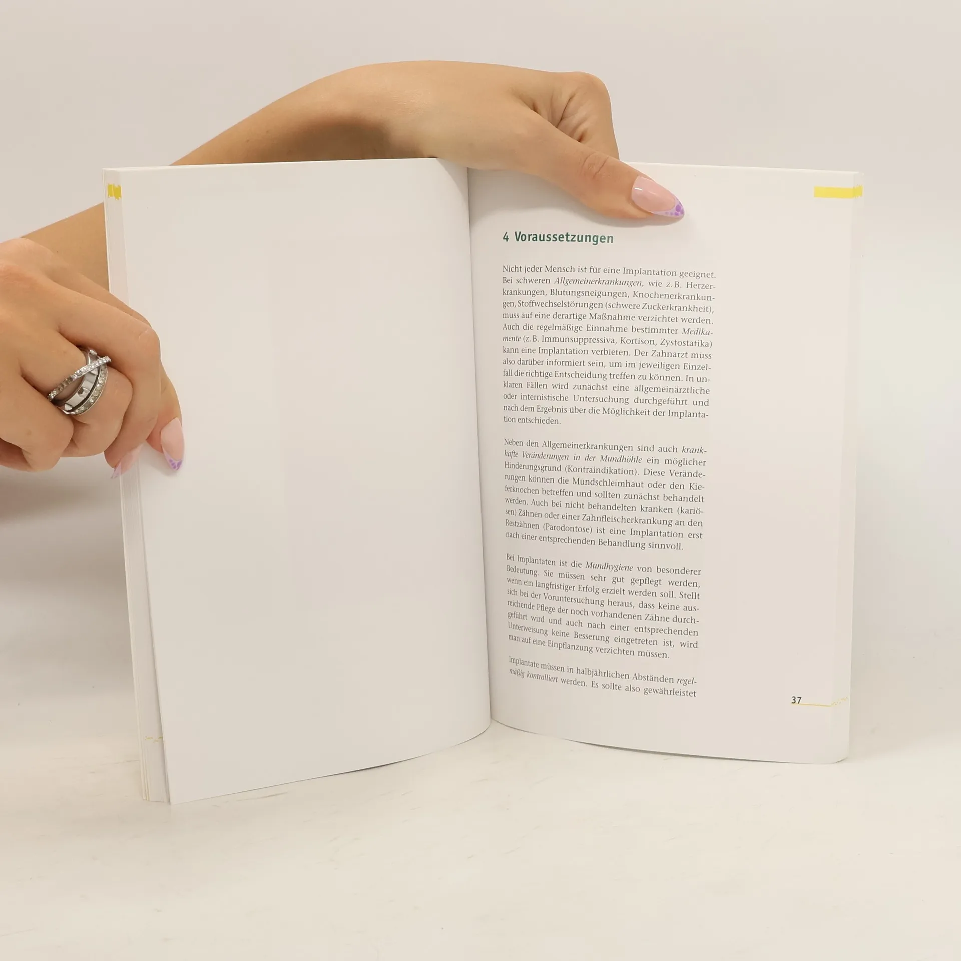 Dieser Ratgeber richtet sich an alle, die sich für zahnärztliche Implantate interessieren. In der Zahnheilkunde hat sich das Fachgebiet der Implantologie etabliert, das sich mit dem Einpflanzen künstlicher Zahnwurzeln beschäftigt. Implantatbehandlungen sind mittlerweile eine bewährte und oft unverzichtbare Ergänzung in der zahnärztlichen Versorgung, wobei über 90% der Implantate erfolgreich im Kieferknochen einheilen und auch nach vielen Jahren funktionsfähig bleiben. Die aktualisierte 4. Auflage informiert umfassend über die Möglichkeiten dieser Therapieform. Zunächst werden die Grundlagen der Zahnärztlichen Implantologie erläutert, einschließlich der Materialien, aus denen Implantate gefertigt werden, und der Einsatzgebiete. Weitere Kapitel beschreiben den Ablauf einer Behandlung, von der Voruntersuchung bis zur Nachsorge und Implantatpflege. Die Inhalte sind anspruchsvoll, aber allgemeinverständlich, unterstützt durch zahlreiche Abbildungen und Fallbeispiele. Das Buch eignet sich hervorragend zur Patientenaufklärung in der zahnärztlichen Praxis. Rezensionen loben die laienverständliche Darstellung der Implantationstechnik und die hilfreichen Informationen für Betroffene vor einer Implantationsbehandlung.