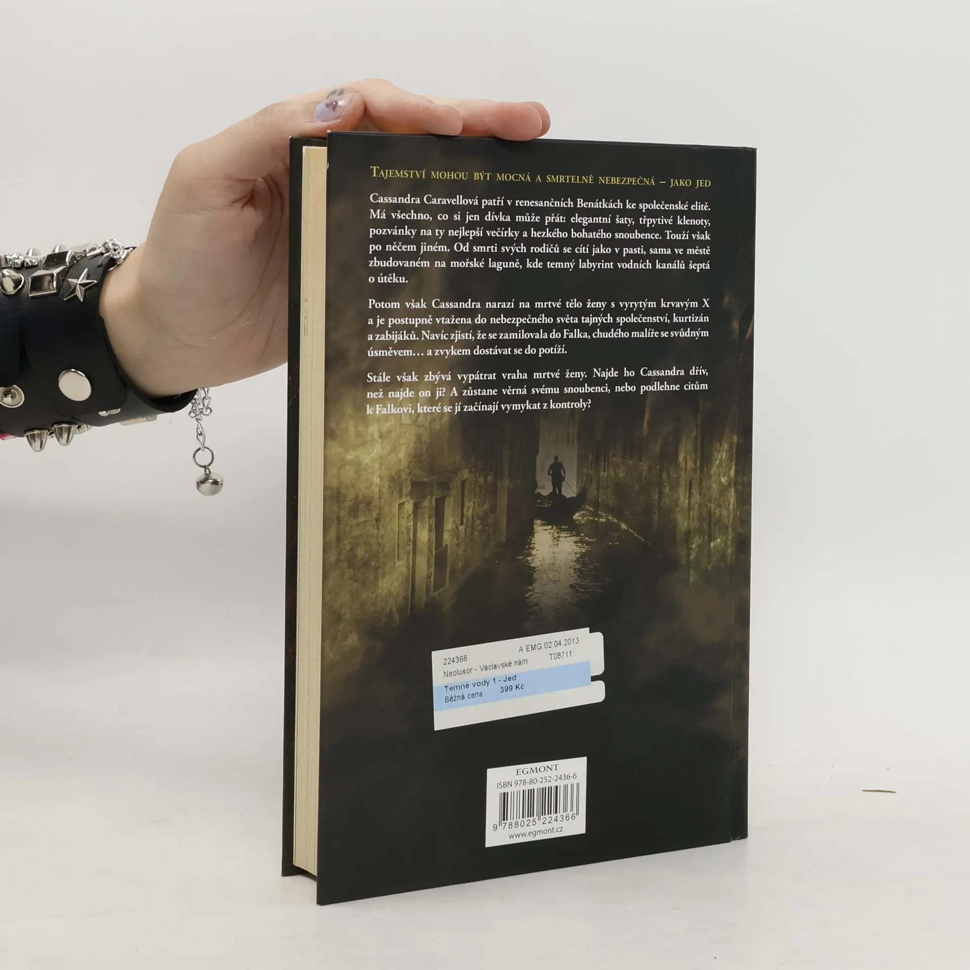 Tajemství mohou být mocná a smrtelně nebezpečná - jako jed. Cassandra Caravellová patří v renesančních Benátkách ke společenské elitě. Má všechno, co si jen dívka může přát: elegantní šaty, třpytivé klenoty, pozvánky na ty nejlepší večírky a hezkého bohatého snoubence. Touží však po něčem jiném. Od smrti svých rodičů se cítí jako v pasti, sama ve městě zbudovaném na mořské laguně, kde temný labyrint vodních kanálů šeptá o útěku. Potom však Cassandra narazí na mrtvé tělo ženy s vyrytým krvavým X a je postupně vtažena do nebezpečného světa tajných společenství, kurtizán a zabijáků. Navíc zjistí, že se zamilovala do Falka, chudého malíře se svůdným úsměvem… a zvykem dostávat se do potíží. Stále však zbývá vypátrat vraha mrtvé ženy. Najde ho Cassandra dřív, než najde on ji? A zůstane věrná svému snoubenci, nebo podlehne citům k Falkovi, které se jí začínají vymykat z kontroly?