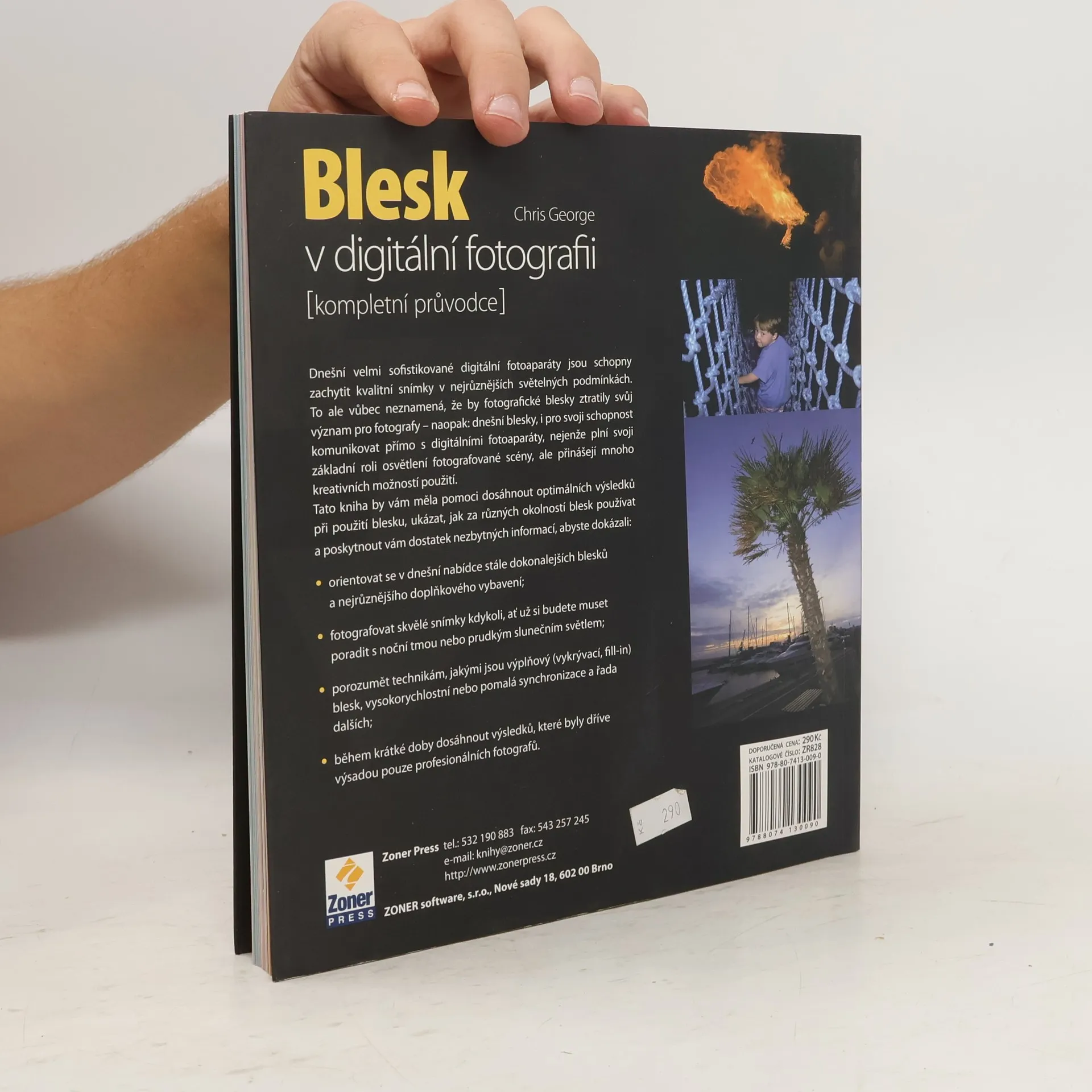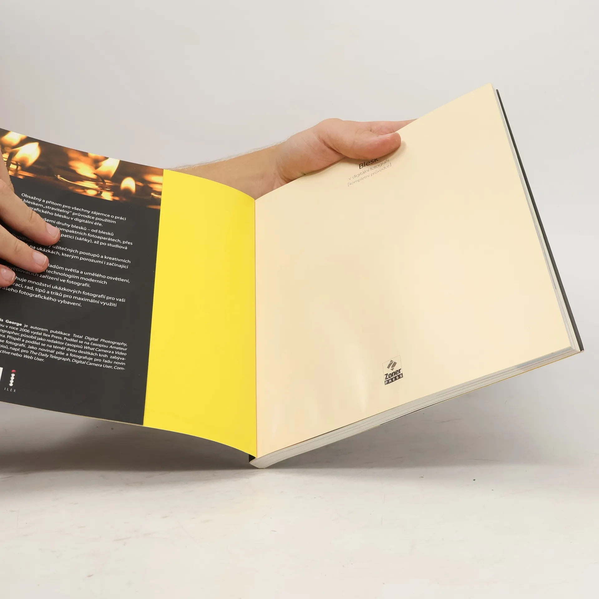 Dnes již velmi širokou sadu knih vydavatelství Zoner Press o fotografování, zejména o digitální fotografii, doplňuje kniha tentokrát věnovaná více technické problematice – blesku. Čtenáři našich knih se s bleskem a jeho použitím mohli setkat v řadě publikací, věnovaných např. fotografování zvěře, makrofotografii, portrétu nebo krajinářské fotografii, konečně bleskem a jeho využitím se zabývá velmi výrazně McNally ve své knize Fotografie – rozhodující momenty. Publikace Blesk v digitální fotografii je ale blesku věnovaná zcela, je určena těm, kteří hledají základního průvodce technikou nebo potřebují vysvětlení nejdůležitějších pojmů, doporučení pro nastavení nebo měření při práci s bleskem. Kniha však vedle čistě technických informací přináší rady i ukázky použití blesku v nejrůznějších podmínkách, v interiéru i exteriéru, od práce se zabudovaným bleskem kompaktních fotoaparátů až po záblesková zařízení a jejich nejrůznější doplňky a pomůcky používané třeba v ateliéru. Kniha je doplněna množstvím inspirativních fotografií, které často ukazují i rozdíly při fotografování bez blesku a s bleskem. Publikace je určena především začínajícím až středně pokročilým fotografům, pro které je fotografování koníčkem.