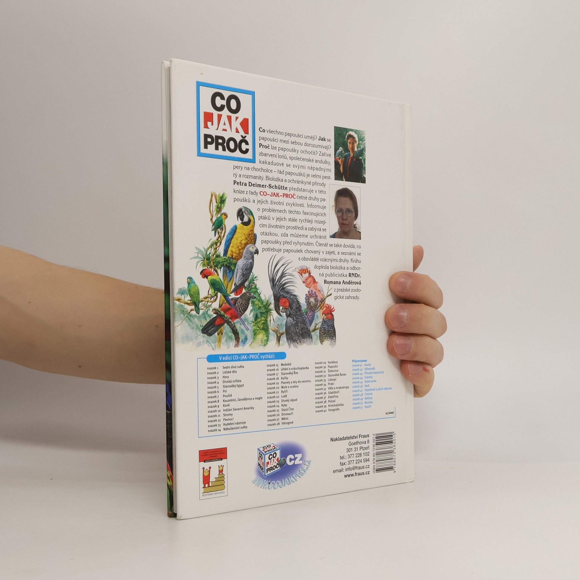 Co pijí papoušci? Jak se papoušci mezi sebou dorozumívají? Proč se nechávají papoušci ochočit? Zářivě zbarvení lori, společenské andulky, kakadu se svými nápadnými péry na chocholce – řád papoušků je pestrý a rozmanitý. Bioložka a ochránkyně přírody Petra Deimar-Schütteová představuje v této knize z řady CO-JAK-PROČ četné druhy papoušků a jejich životní zvyklosti. Informuje o problémech těchto fascinujících ptáků v jejich neustále mizejícím životním prostředí a zkoumá otázku, zda můžeme uchránit papoušky před vyhynutím. Čtenář se dovídá, co potřebuje papoušek v lidské péči a poznává obzvláště vzácná mláďata. Knihu doplnila bioložka RNDr. Romana Anděrová z pražské zoologocké zahrady.