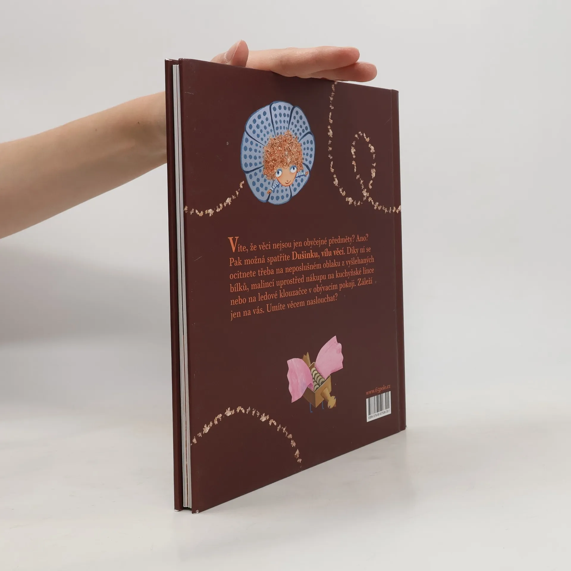 Sedm příběhů pro děti, které ví, že věci nejsou jen obyčejné předměty. Právě takové děti totiž můžou spatřit Dušinku, vílu věcí, a spolu s ní zažít nečekaná dobrodružství třeba uprostřed nákupu vyskládaného na kuchyňské lince, na neposluš¬ném oblaku z vyšlehaných bílků nebo na ledem pokryté klouzačce v obývacím pokoji. Příběhy napsala Ester Stará, autorka oceněných knih pro děti A pak se to stalo! a Chrochtík a Kvikalka na cestě za blýskavým prasátkem a ilustrovala přední česká výtvarnice Lucie Dvořáková.