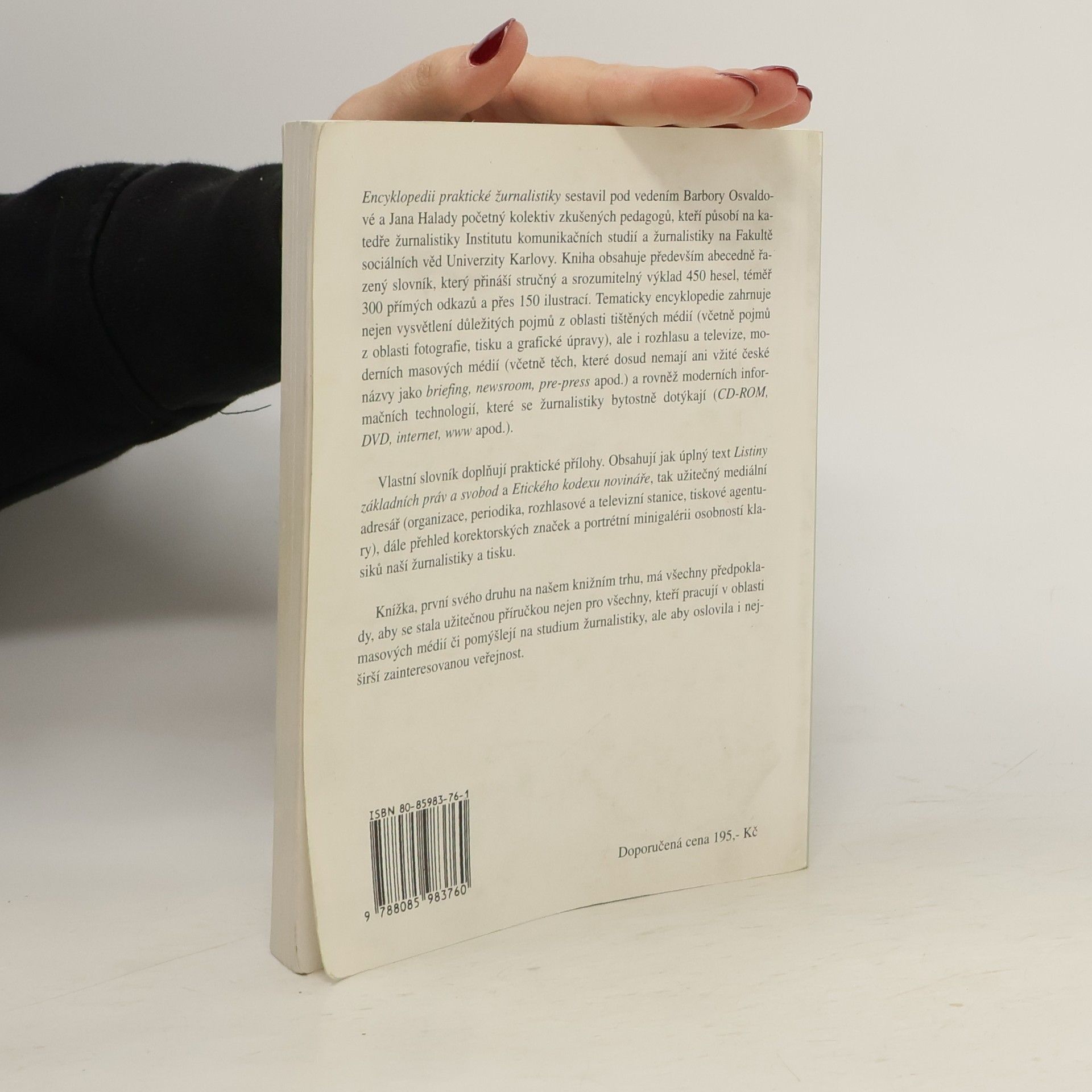 Encyklopedii praktické žurnalistiky sestavil pod vedením Barbory Osvaldové a Jana Halady početný kolektiv zkušených pedagogů, kteří působí na katedře žurnalistiky Institutu komunikačních studií a žurnalistiky na Fakultě sociálních věd Univerzity Karlovy. Kniha obsahuje především abecedně řazený slovník, který přináší stručný a srozumitelný výklad 450 hesel, téměř 300 přímých odkazů a přes 150 ilustrací. Tematicky encyklopedie zahrnuje nejen vysvětlení důležitých pojmů z oblasti tištěných médií (včetně pojmů z oblasti fotografie, tisku a grafické úpravy), ale i rozhlasu a televize, moderních masových médií (včetně těch, které dosud nemají ani vžité české názvy jako briefing, newsroom, pre-press apod.) a rovněž moderních informačních technologií, které se žurnalistiky bytostně dotýkají (CD-ROM, DVD, internet, www apod.). Vlastní slovník doplňují praktické přílohy. Obsahují jak úplný text Listiny základních práv a svobod a Etického kodexu novináře, tak užitečný mediální adresář (organizace, periodika, rozhlasové a televizní staice, tiskové agentury), dále přehled korektorských značek a portrétní minigalérii osobností klasiků naší žurnalistiky a tisku. Knížka, první svého druhu na našem knižním trhu, má všechny předpoklady, aby se stala užitečnou příručkou nejen pro všechny, kteří pracují v oblasti masových médií či pomýšlejí na studium žurnalistiky, ale aby oslovila i nejširší zainteresovanou veřejnost.