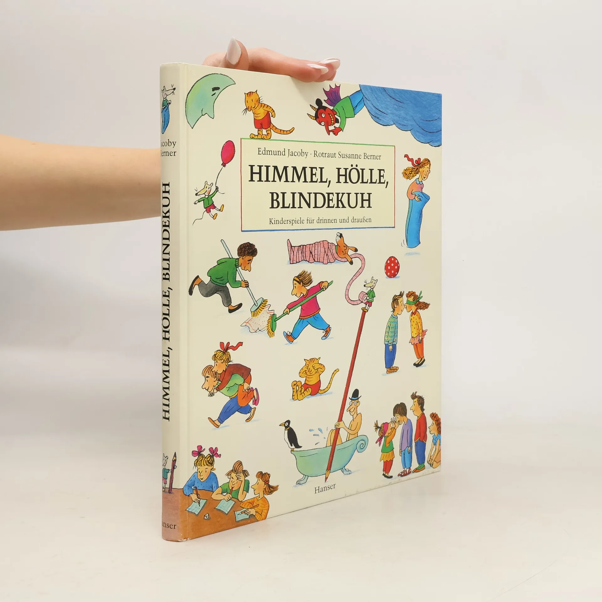 Dieses Spielebuch enthält 200 Spiele, geordnet nach Spielarten. Die Erklärungen der Spiele sind leicht zu verstehen, da die Texte präzise und mit Witz geschrieben sind. Wer also wissen will, was man zum Beispiel an Kindergeburtstagen oder bei Regenwetter spielen kann, der hat hier einen idealen Rat- und Ideengeber. Das Spielebuch ist darüber hinaus aber auch ein Vergnügen für sich: Man kann darin einfach nur blättern, stöbern, lesen und sich an den wunderbaren Bildern freuen. Himmel, Hölle, Blindekuh stand 1994 auf der Auswahlliste zum Deutschen Jugendliteraturpreis in der Sparte Kinderbuch.