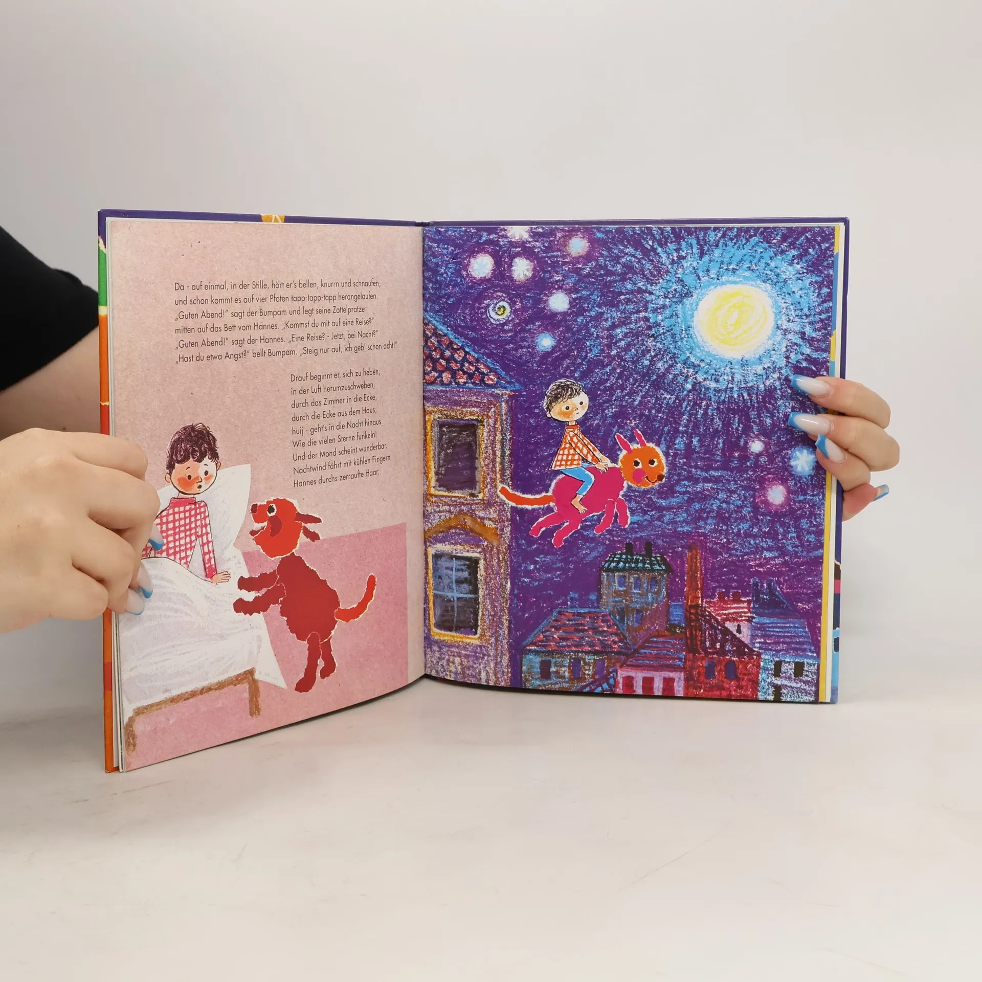 Hannes ist ein verträumtes Kind. Auf der Hauswand sieht er Tiere, in den Wolken ein Segelschiff und hinter den Gewitterwolken die Regenfrau. Als er die basteln will und Haare für sie braucht, schneidet er sich einfach eine seiner schwarzen Locken ab. Da nimmt ihm die Kindergärtnerin die Schere weg und jetzt muss Hannes das Buntpapier reißen, statt es auszuschneiden. Er rupft und zupft und plötzlich kommt dabei ein Tier heraus: der Bumpam! Die anderen Kinder lachen über Hannes. In der Nacht besucht ihn der Bumpam und nimmt ihn mit ins gerissene Land, in das man nur ohne Schere darf. Dort gibt es die schönsten Tiere, Blumen und Landschaften. Am nächsten Tag im Kindergarten kann Hannes es kaum erwarten, ein Bild mit vielen Tieren zu reißen. Das wird etwas ganz Besonderes und plötzlich möchten alle anderen von Hannes lernen, wie man das macht.