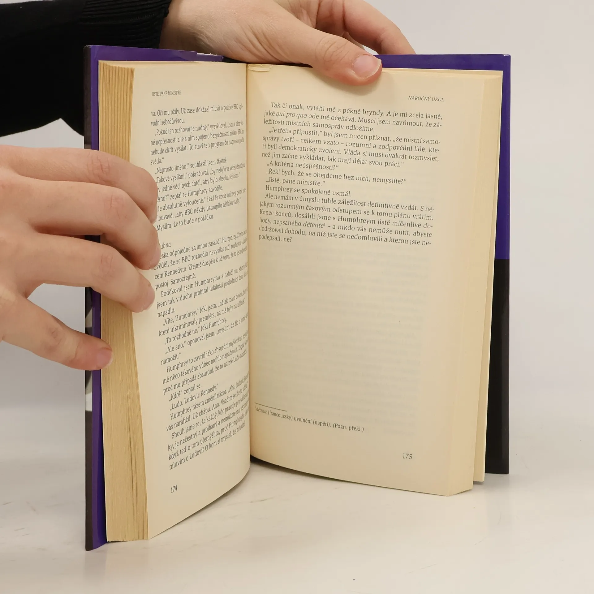 Ve druhé části knižní podoby vynikajícího televizního seriálu z prostředí vysoké politiky, který byl s velkým úspěchem uveden v řadě zemí a znají jej i čeští televizní diváci, sledujeme kariérní postup britského politika Jamese Hackera až k vytoužené funkci premiéra. Politické kuloáry jsou podány tak živě, až čtenáře překvapí, kolik podobných situací znají z české reality a jistě si vychutnají repliky plné klasického anglického humoru. zdroj: http://www.neoluxor.cz/