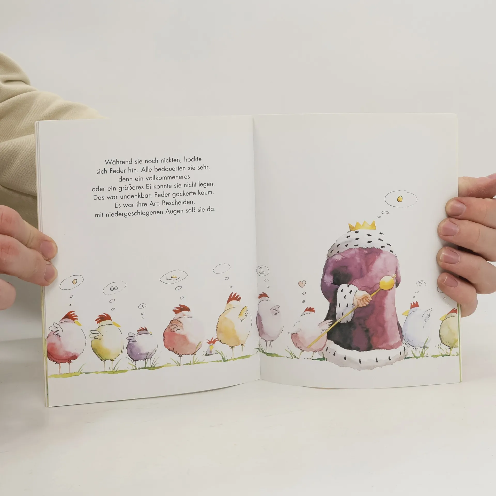 Jedes der Hühner will das Schönste sein! Und weil sie sich absolut nicht einigen können, ruft der König einen Wettstreit aus: Welches Huhn legt das schönste Ei? Alle drei geben sich große Mühe, jedes Ei ist etwas ganz Besonderes. Nun der steht der König vor einer Herausforderung … ob er eine weise Entscheidung trifft, die keinen Neid hervorruft?