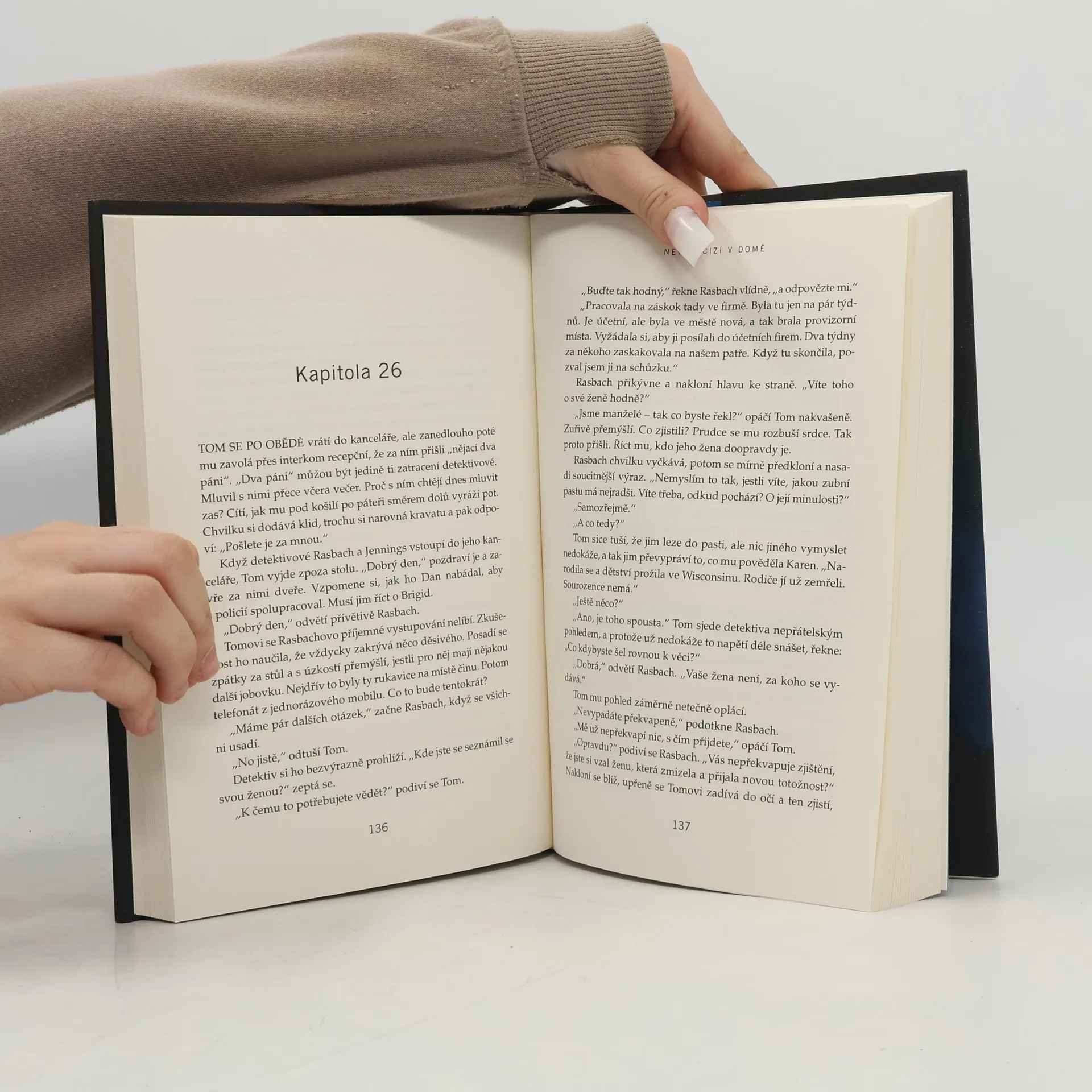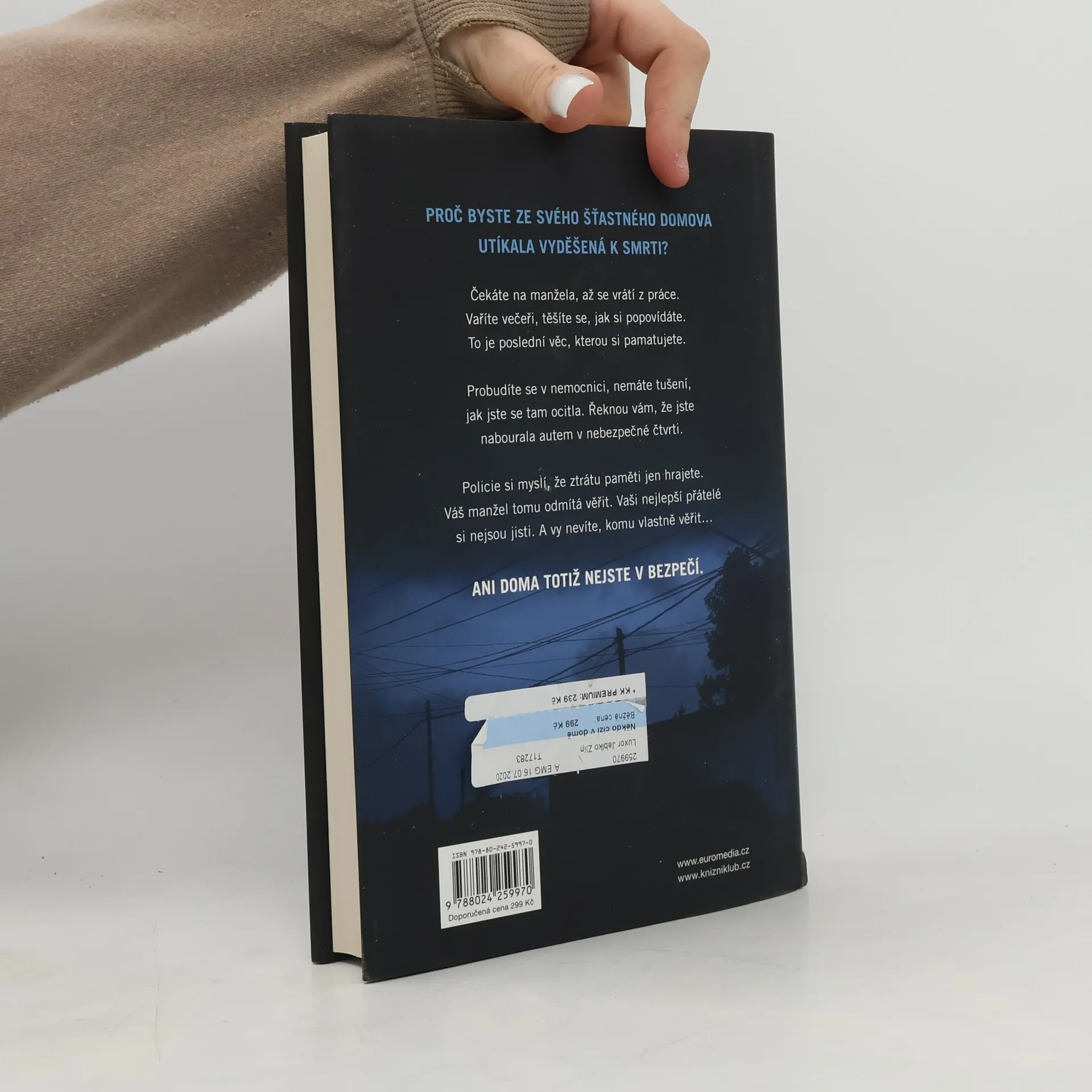 V téhle útulné čtvrti spokojených domovů zůstávají nebezpečné lži uzavřeny za dveřmi… Shari Lapena, autorka thrilleru roku 2017 Manželé odvedle, přichází s dalším rodinným dramatem plným tajemství a nečekaných zvratů, které nikdy nepřestanou překvapovat. Karen a Tom Kruppovi jsou šťastní – vzali se teprve nedávno a vlastní nádherný dům poblíž New Yorku. Jednoho dne se Tom vrátí domů a zjistí, že Karen zmizela – její auto je pryč a zdá se, že odjela ve spěchu. Nevzala si dokonce ani kabelku, telefon, doklady. Krátce nato se Tom dozví, že Karen měla nehodu a leží v nemocnici s otřesem mozku a ztrátou paměti. Po čase se Karen, odhodlaná vyléčit se a zapomenout, vrací s Tomem domů. Ale zdá se, že se tam něco změnilo. Něco není v pořádku. Někdo tam byl. Někdo cizí. Jenže v tomhle domě je každý cizí. Každý má něco, co by podle něj mělo zůstat skryto. Něco, kvůli čemu by raději vraždil, jen aby si to mohl nechat pro sebe...
