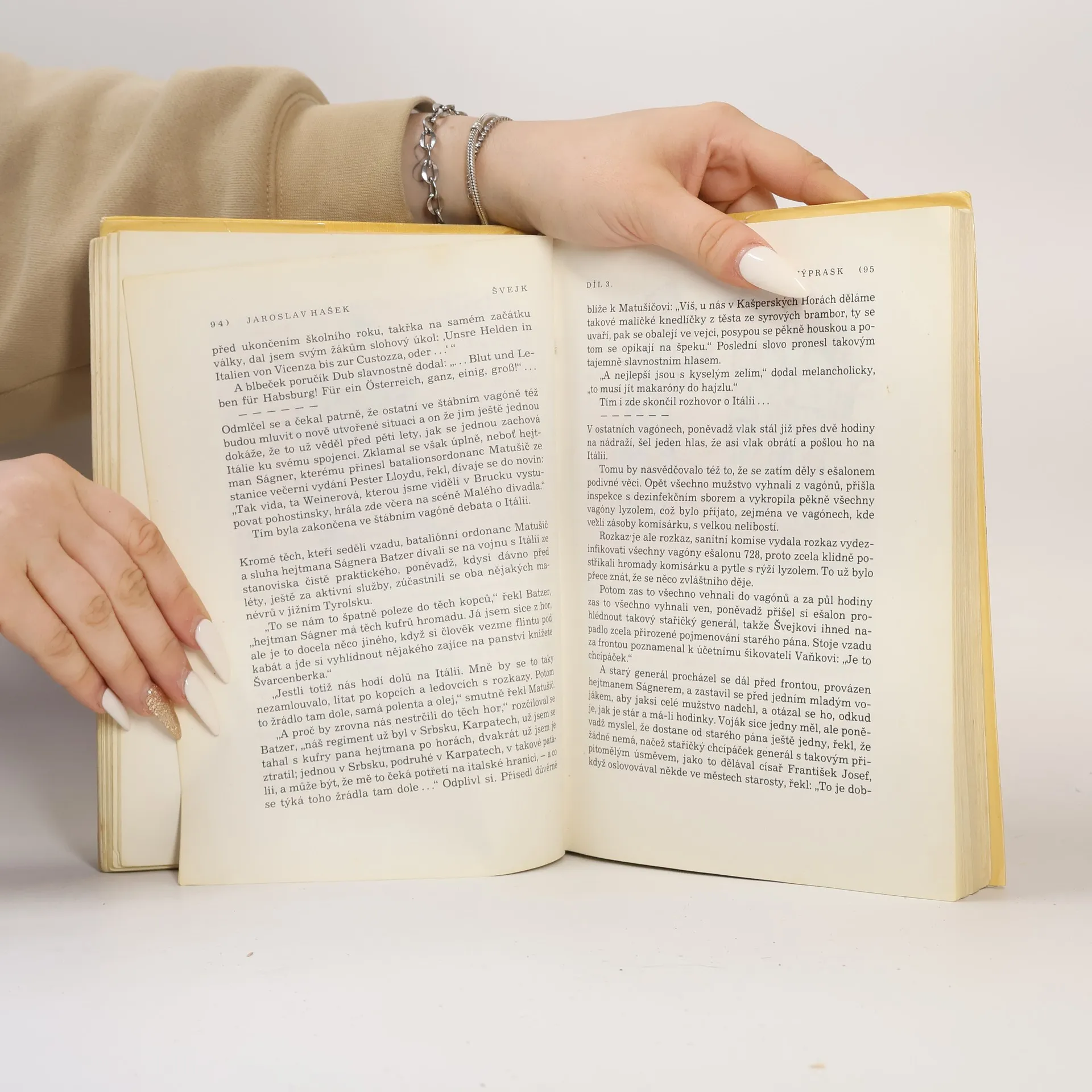 Slavný výprask - 91. pěší pluk je opět naložen do vlaku, který jej veze jako „novou skupinu lidí hnaných na jatky“ do Haliče na ruskou frontu. Hašek tuto pouť přes celé Uhry popisuje tak, že se román stává skutečnou obžalobou války a stupidních důstojníků, kterým nejde o nic jiného než o vlastní prospěch bez ohledu na osudy vojáků, kterým mají velet. Jejich schopnosti Hašek popisuje takto: „Byl to pán velkých vojenských schopností, které se mu vrazily do nohou ve formě podágry“. Názory prostých vojáků na válku charakterizuje Hašek slovy: „Po celou dobu železniční přepravy bataliónu, který měl sklízet válečnou slávu, až projde pěšky od Laborce východní Haličí na front, vedly se ve vagónu, kde byl jednoroční dobrovolník a Švejk, opět podivné řeči, víceméně velezrádného obsahu“. Na konci dílu je Švejk vyslán jako kvartýrmachr zajistit pro svou kumpanii nocleh ve Felštýně. Když Švejk dojde k malému rybníku, setká se tam s uprchlým ruským zajatcem, který se tam koupal a po spatření Švejka se dal nahý na útěk. Švejk si oblékne jeho uniformu, protože je zvědav, jak by mu asi slušela. V této uniformě ho najde patrola polního četnictva, která tohoto ruského uprchlíka hledala. Jsou to Maďaři, kteří Švejkovi nerozumí a přes jeho protesty ho zařadí do transportu ruských zajatců určených pracovat na opravě železniční trati. Tak Švejk upadne omylem do rakouského zajetí. Pokračování slavného výprasku - Poté, co je zjištěno, že Švejk je Čech, je na něj pohlíženo jako na zběha a polní soud ho odsoudí k smrti. Duchovní útěchu před popravou mu má poskytnout polní kurát Martinec, původně skutečně nábožensky založený muž, který stykem s opilými důstojníky postupně mravně upadá, což si nepřestává v skrytu duše neustále vyčítat. Švejk jej však považuje za dalšího vězně a svými proslovy jej tak vyděsí, že Martinec z cely prchne na důstojnický večírek, kde se zpije do bezvědomí „s přesvědčením, že se hraje o jeho duši a on sám že je mučedníkem“. Nakonec se vše vysvětlí a Švejk se opět ocitne u své marškumpanie. Haškův text pak končí proslovem poručíka Duba „S okresním hejtmanem jsme vždy říkávali: Patriotismus, věrnost k povinnosti, sebepřekonání, to jsou ty pravé zbraně ve válce! Připomínám si to zejména dnes, když naše vojska v dohledné době překročí hranice“. Vše, co případně v knize následuje za touto větou, je pokračování dopsané od Karla Vaňka.