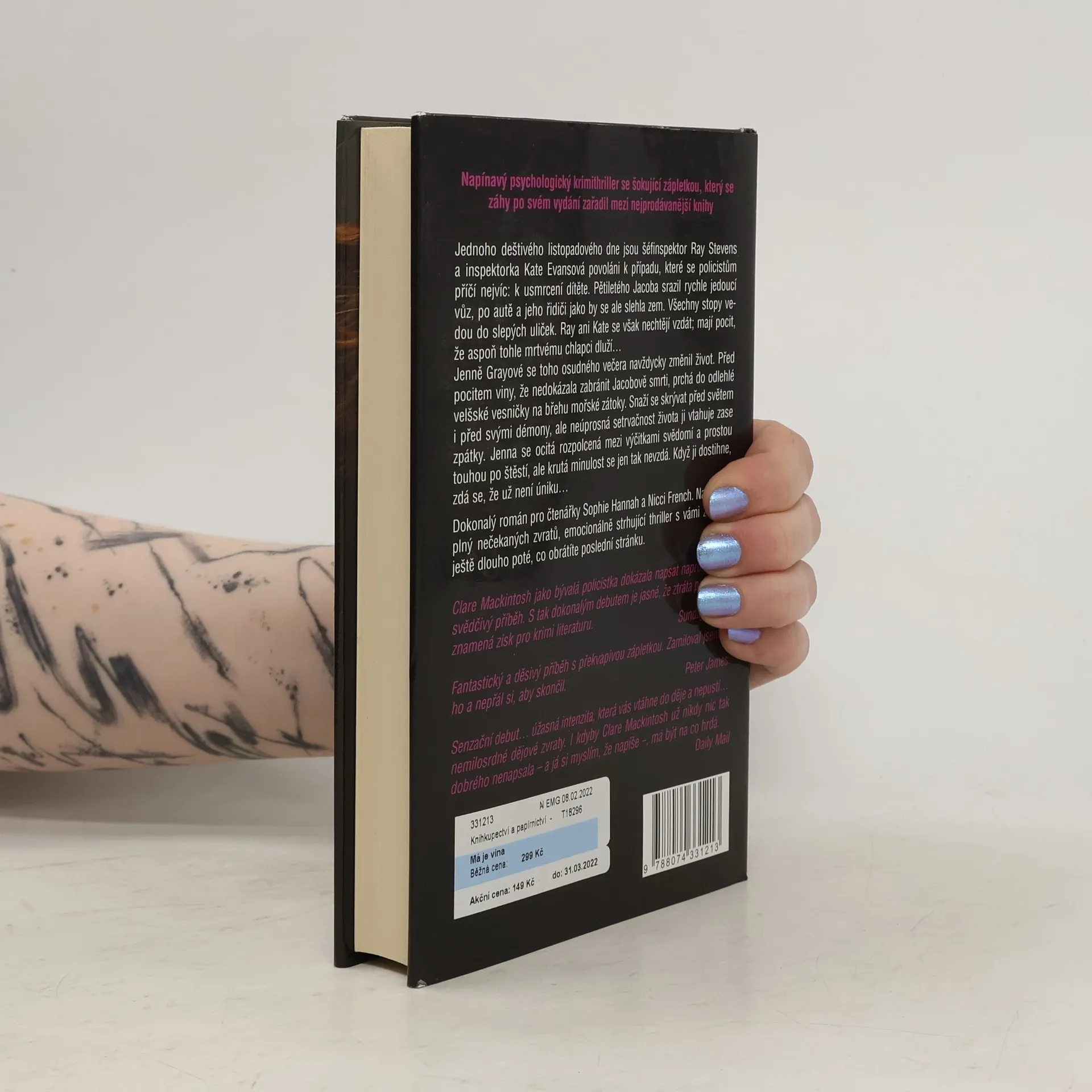 Jednoho deštivého listopadového dne jsou šéfinspektor Ray Stevens a inspektorka Kate Švandová povoláni k případu, které se policistům příčí nejvíc: k usmrcení dítěte. Pětiletého Jakoba srazil rychle jedoucí vůz, po autě a jeho řidiči jako by se ale slehla zem. Všechny stopy vedou do slepých uliček. Ray ani Kate se však nechtějí vzdát; mají pocit, že aspoň tohle mrtvému chlapci dluží… Janně Grayové se toho osudného večera navždycky změnil život. Před pocitem viny, že nedokázala zabránit Jakobově smrti, prchá do odlehlé velšské vesničky na břehu mořské zátoky. Snaží se skrývat před světem i před svými démony, ale neúprosná setrvačnost života ji vtahuje zase zpátky. Jenna se ocitá rozpolcená mezi výčitkami svědomí a prostou touhou po štěstí, ale krutá minulost se jen tak nevzdá. Když ji dostihne, zdá se, že už není úniku… Napínavý psychologický thriller se šokující zápletkou. Clare Mackintoshová jako bývalá policistka dokázala napsat naprosto přesvědčivý příběh. S tak dokonalým debutem je jasné, že ztráta pro policii znamená zisk pro krimi literaturu.