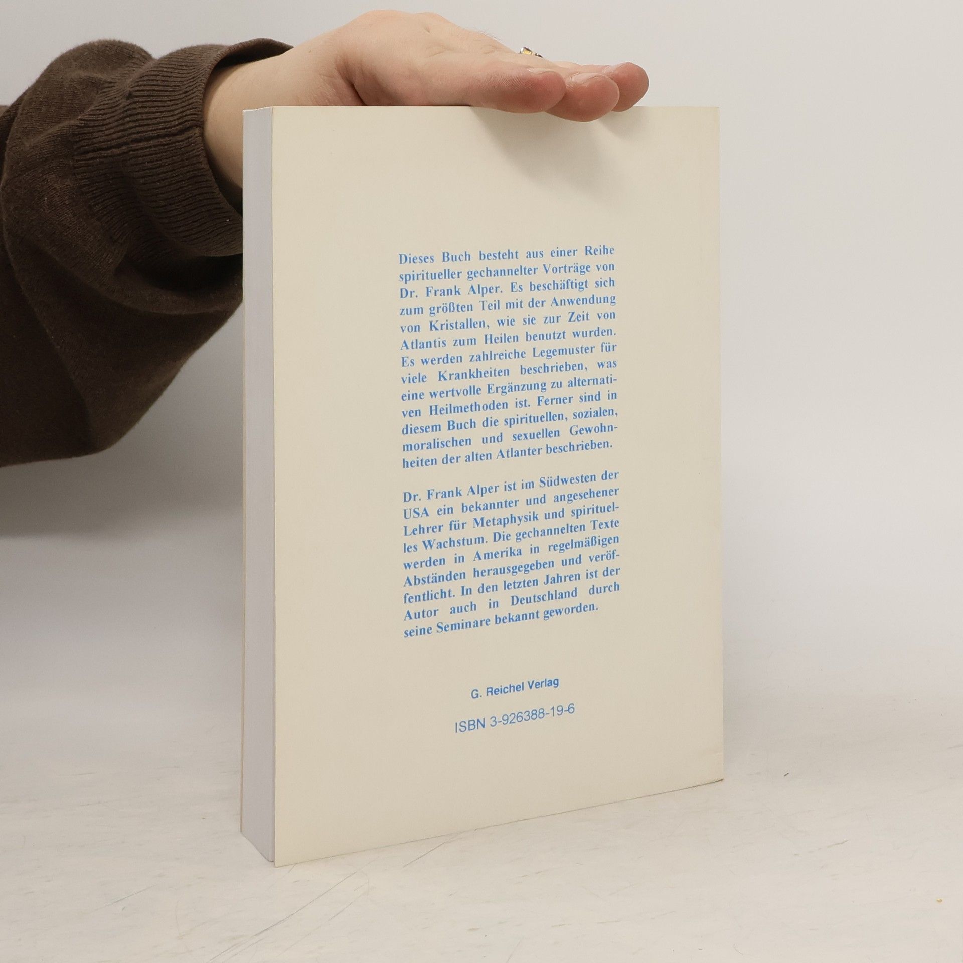 Dieses Buch besteht aus einer Reihe spiritueller gechannelter Vorträge von Dr. Frank Alper. Es beschäftigt sich zum größten Teil mit der Anwendung von Kristallen, wie sie zur Zeit von Atlantis zum Heilen benutzt wurden. Es werden zahlreiche Legemuster für viele Krankheiten beschrieben, was eine wertvolle Ergänzung zu alternativen Heilmethoden ist. Ferner sind in diesem Buch die spirituellen, sozialen, moralischen und sexuellen Gewohnheiten der alten Atlanter beschrieben.