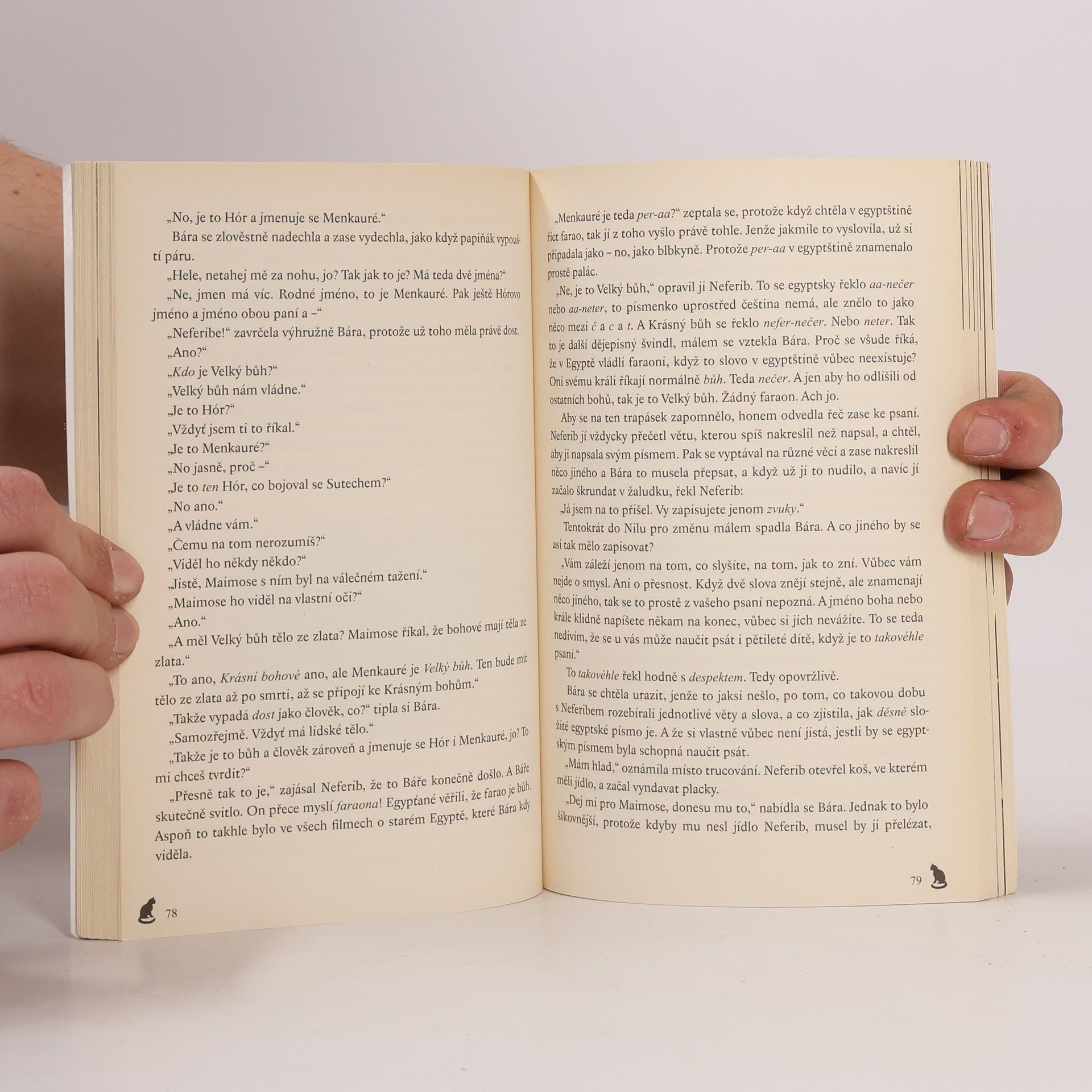 Tentokrát atlas poslal Báru do minulosti sice za dne, ale zato ji šoupl skoro doprostřed Nilu, ve kterém se proháněli hladoví krokodýli. Ještě že byl poblíž šťastnou náhodou lovec Maimose! Nebo to snad nebyla náhoda? Je možné, že Maimose na místo přivedla kočičí bohyně Bastet, aby si na Báře krokodýli nepochutnali? Ať tak či onak, zdá se, že Bastet má s Bárou určité plány. Když totiž Bára v jejím chrámu usne, zelenooká bohyně jí ve snu předá tajemný vzkaz: Ušlechtilé srdce a síla lva nechť duši Réovu doprovodí k bílým zdem - zesnulý Velký bůh nesmí zemřít! Sachmet tě volá! Pátrání po smyslu vzkazu přivede Báru, Maimose a jeho bratra Neferiba nejen na stopu spiknutí proti egyptskému králi Menkauréovi (to je další dějepisný švindl, Egypťané vůbec neznají slovo faraon!), ale nakonec až do samého nitra pyramidy.