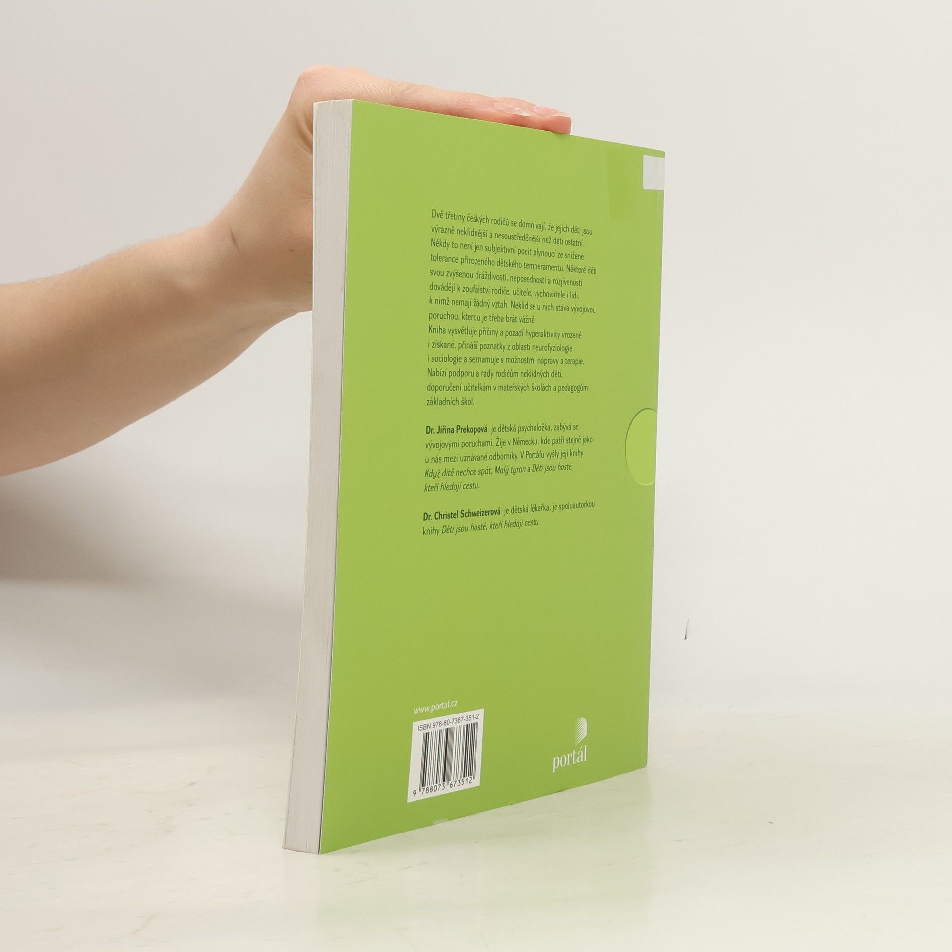 Dvě třetiny českých rodičů se domnívají, že jejich děti jsou výrazně neklidnější a nesoustředěnější než děti ostatní. Někdy to není jen subjektivní pocit plynoucí ze snížené tolerance přirozeného dětského temperamentu. Některé děti svou zvýšenou dráždivostí, neposedností a rozjíveností dovádějí k zoufalství rodiče, učitele, vychovatele i lidi, k nimž nemají žádný vztah. Neklid se u nich stává vývojovou poruchou, kterou je třeba brát vážně. Kniha vysvětluje příčiny hyperaktivity vrozené i získané, přináší poznatky z oblasti neurofyziologie i sociologie a seznamuje s možnostmi nápravy-terapie. Nabízí podporu a rady rodičům neklidných dětí, doporučení učitelkám v mateřských školách a pedagogům ZŠ. Dr. J. Prekopová je uznávaná dětská psycholožka, zabývá se vývojovými poruchami. Žije v Německu. V Portálu vyšly její knihy Když dítě nechce spát, Malý tyran a Děti jsou hosté, kteří hledají cestu. Dr. Ch. Schweizerová je dětská lékařka, spoluautorka knihy Děti jsou hosté, kteří hledají cestu.
