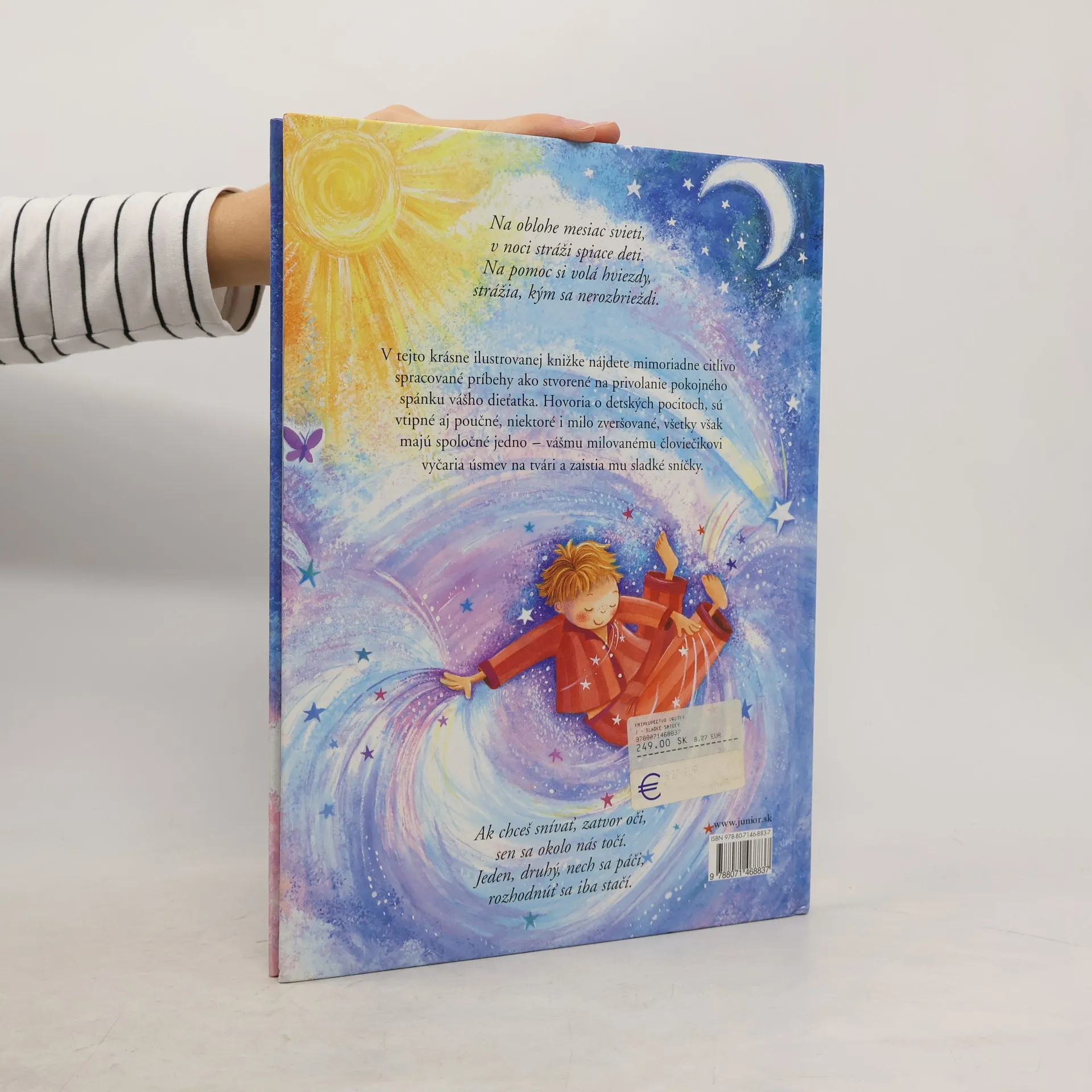 V tejto krásne ilustrovanej knižke nájdete mimoriadne citlivo spracované príbehy ako stvorené na privolanie pokojného spánku vášho dieťatka. Hovoria o detských pocitoch, sú vtipné aj poučné, niektoré i milo zveršované, všetky však majú spoločné jedno - vášmu milovanému človiečikovi vyčaria úsmev na tvári a zaistia mu sladké sníčky.