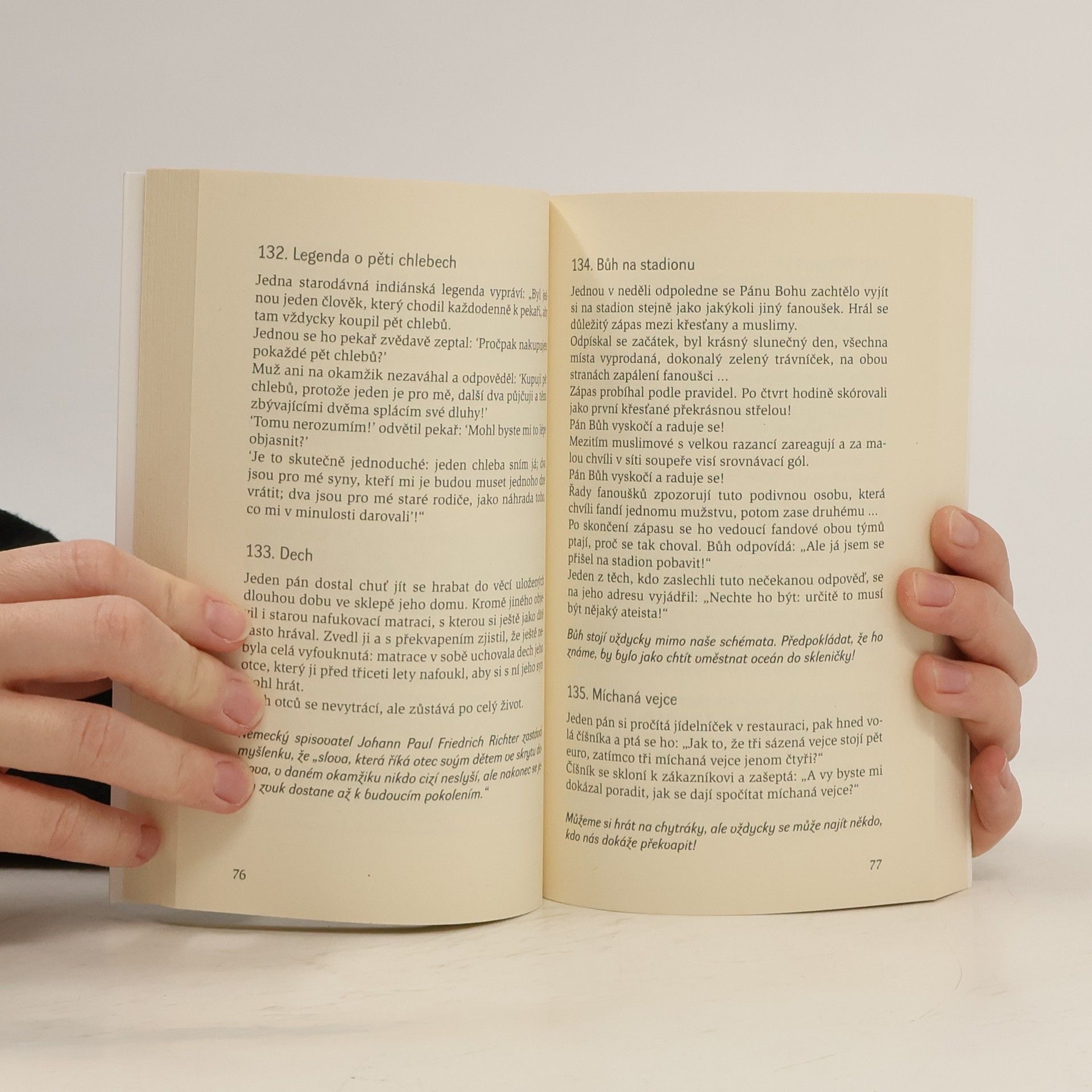 Lépe je žít bez jídla než bez příběhů, protože bez jídla člověk zemře, ale bez příběhů žije jako mrtvý. Příběhy pro osvěžení duše jsou sbírkou krátkých, čtivých příběhů s moudrou pointou, tedy nejsou jen prostředkem k překonání nudy. V jádru každého příběhu se skrývá nějaké moudro, útěcha a povzbuzení pro chvíle nesnází a nezřídka světlo pro rozhodování mezi tím, co je zlato, a co se jen tak třpytí… S užitkem si je přečte každý „pro osvěžení své duše“, i když původně byla sbírka napsána pro katechety, rodiče, vychovatele a kněze, zkrátka pro všechny, kdo chtějí předávat křesťanské a všelidské hodnoty, neradi by však své posluchače unavovali moralizujícími řečmi.
