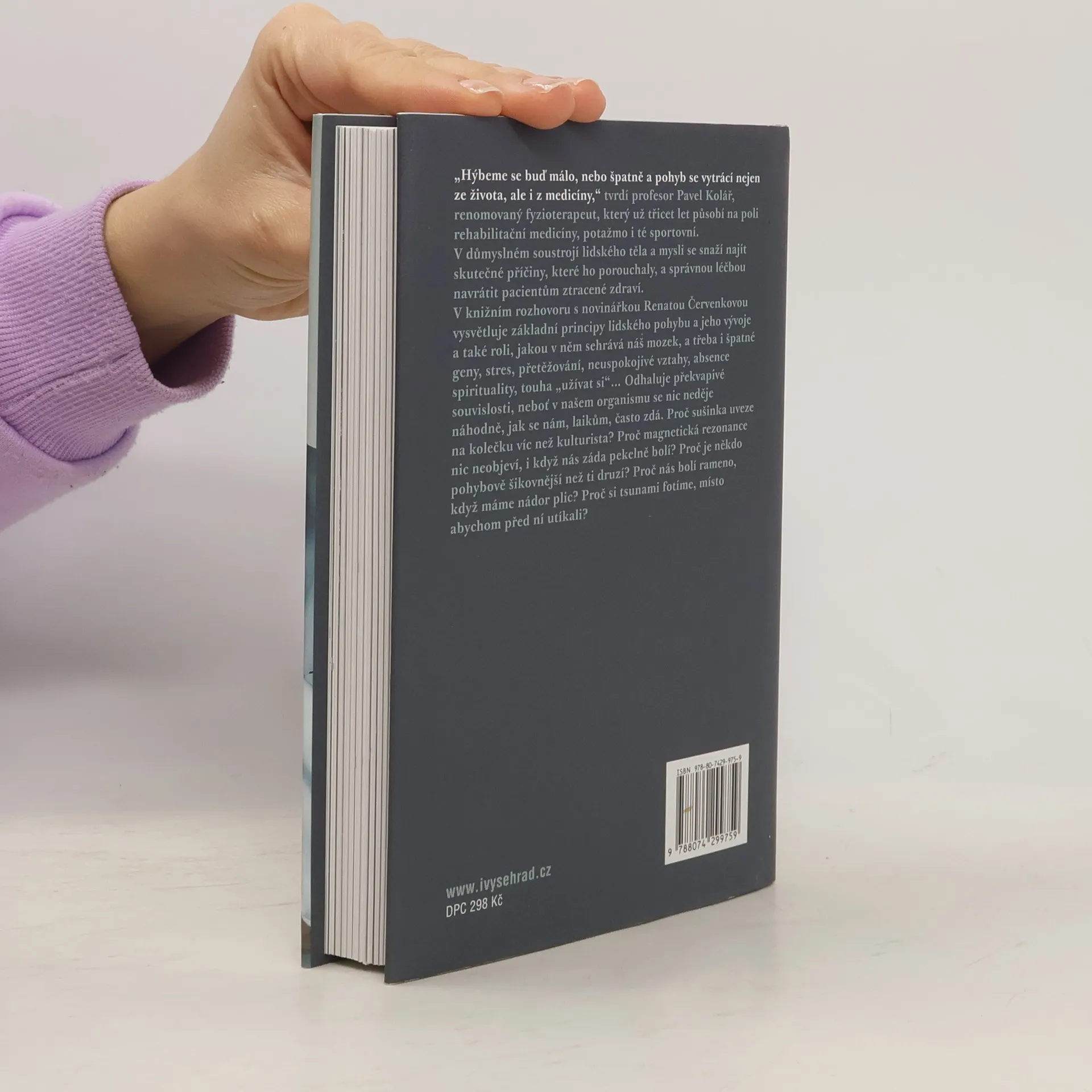 Knižní rozhovor s renomovaným fyzioterapeutem prof. Kolářem. „Hýbeme se buď málo, nebo špatně a pohyb se vytrácí nejen ze života, ale i z medicíny,“ tvrdí profesor Pavel Kolář, renomovaný fyzioterapeut, který už třicet let působí na poli rehabilitační medicíny, potažmo i té sportovní. V důmyslném soustrojí lidského těla a mysli se snaží najít skutečné příčiny, které ho porouchaly, a správnou léčbou navrátit pacientům ztracené zdraví. V rozhovorech s novinářkou Renátou Červenkovou vysvětluje základní principy lidského pohybu a jeho vývoje a také roli, jakou v něm sehrává náš mozek a třeba i špatné geny, stres, přetěžování, neuspokojivé vztahy, absence spirituality, touha „užívat si“... Odhaluje překvapivé souvislosti, neboť v našem organismu se nic neděje náhodně, jak se nám, laikům, často zdá. Proč nás bolí rameno, když máme nádor plic? Proč sušinka uveze na kolečku víc než kulturista? Proč magnetická rezonance nic neobjeví, i když nás záda pekelně bolí? Proč je někdo pohybově šikovnější než ti druzí? Proč si tsunami fotíme, místo abychom před ní utíkali?