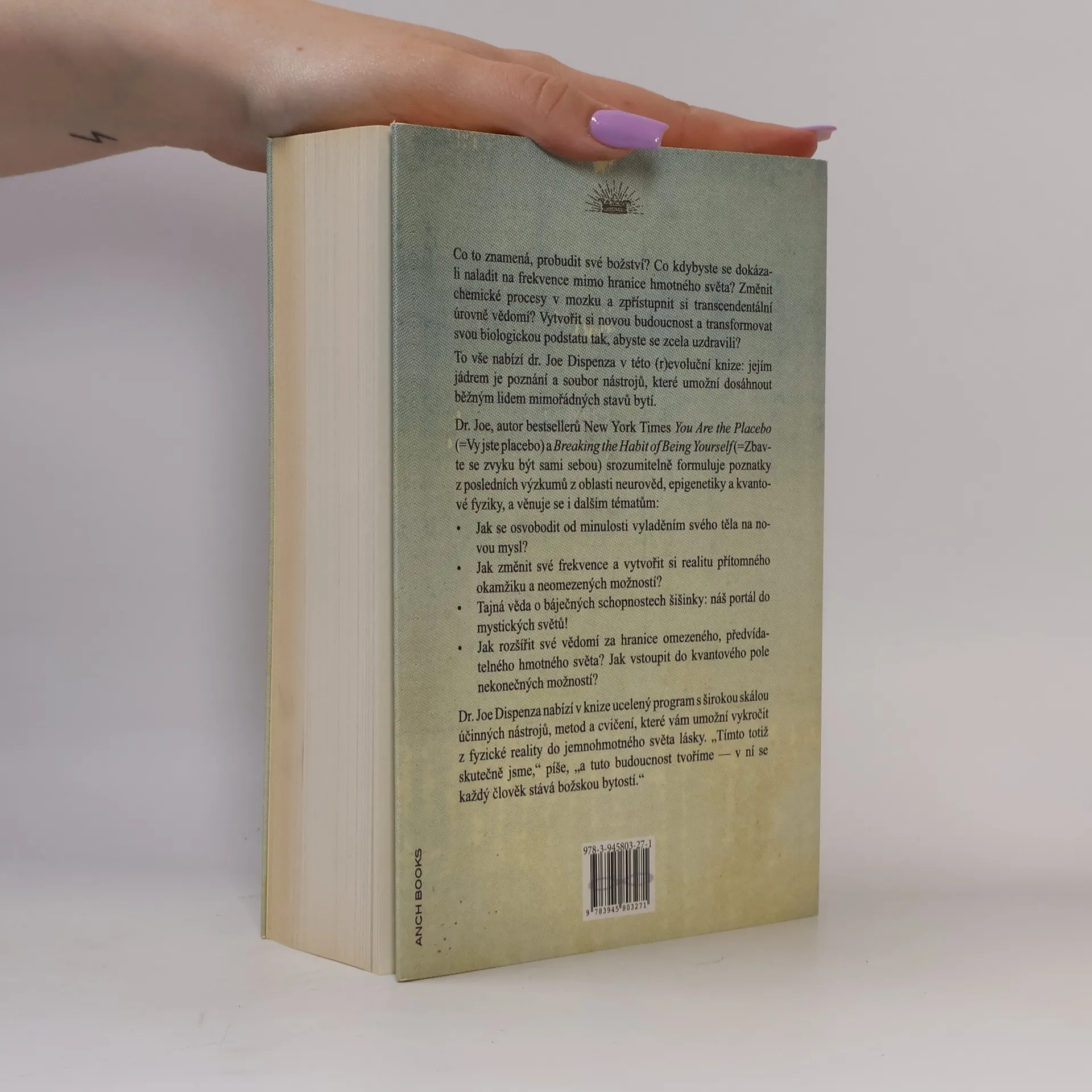 Co to znamená, probudit své božství? Co kdybyste se dokázali naladit na frekvence mimo hranice hmotného světa? Změnit chemické procesy v mozku a zpřístupnit si transcendentální úrovně vědomí? Vytvořit si novou budoucnost a transformovat svou biologickou podstatu tak, abyste se zcela uzdravili? To vše nabízí dr. Joe Dispenza v této (r)evoluční knize: jejím jádrem je poznání a soubor nástrojů, které umožní dosáhnout běžným lidem mimořádných stavů bytí. Dr. Joe Dispenza autor bestsellerů You Are the Placebo (=Vy jste placebo) a Breaking the Habit of Being Yourself (=Zbavte se zvyku být sami sebou) v knize srozumitelně formuluje poznatky z posledních výzkumů z oblasti neurověd, epigenetiky a kvantové fyziky, a věnuje se i dalším tématům: • Jak se osvobodit od minulosti vyladěním svého těla na novou mysl? • Jak změnit své frekvence a vytvořit si realitu přítomného okamžiku a neomezených možností? • Tajná věda o báječných schopnostech šišinky: náš portál do mystických světů! • Jak rozšířit své vědomí za hranice omezeného, předvídatelného hmotného světa? Jak vstoupit do kvantového pole nekonečných možností? Autor nabízí ucelený program s širokou skálou účinných nástrojů, metod a cvičení, které vám umožní vykročit z fyzické reality do jemnohmotného světa lásky. „Tímto totiž skutečně jsme,“ píše, „a tuto budoucnost tvoříme — v ní se každý člověk stává božskou bytostí.“
