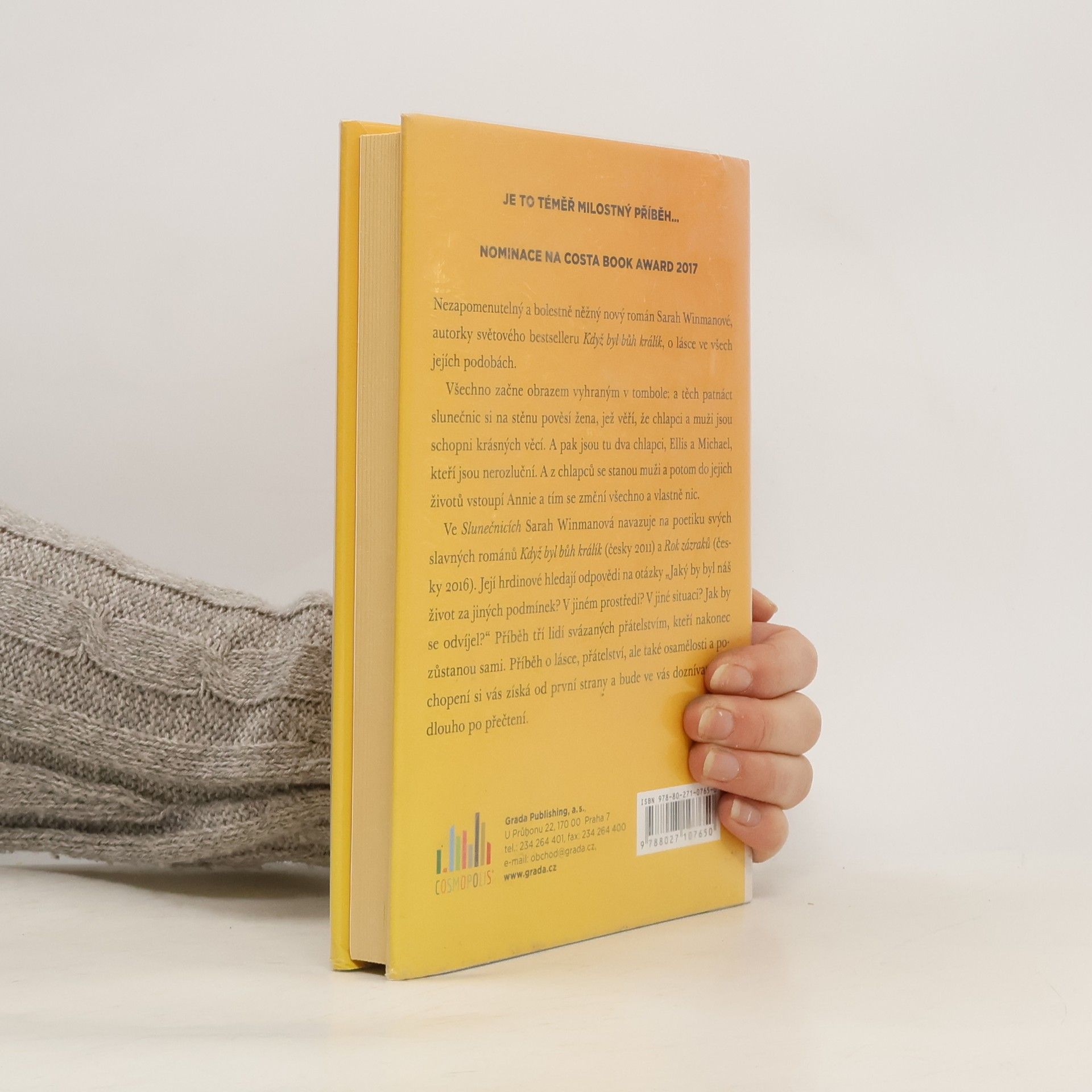 Je to téměř milostný příběh. Ale tak jednoduché to není… Nezapomenutelný a bolestně něžný nový román Sarah Winmanové, autorky světového bestselleru Když byl bůh králík, o lásce ve všech jejích podobách. Všechno začne obrazem vyhraným v tombole: a těch patnáct slunečnic si na stěnu pověsí žena, jež věří, že chlapci a muži jsou schopni krásných věcí. A pak jsou tu dva chlapci, Ellis a Michael, kteří jsou nerozluční. A z chlapců se stanou muži a potom do jejich životů vstoupí Annie a tím se změní všechno a vlastně nic. Ve Slunečnicích Sarah Winmanová navazuje na poetiku svých slavných románů Když byl bůh králík (česky 2012) a Rok zázraků (česky 2016). Její hrdinové hledají odpovědi na otázky: „Jaký by byl náš život za jiných podmínek? V jiném prostředí? V jiné situaci? Jak by se odvíjel?“ Příběh tří lidí svázaných přátelstvím, kteří nakonec zůstanou sami. Příběh o lásce, přátelství, ale také osamělosti a pochopení ve vás bude doznívat ještě dlouho po přečtení.