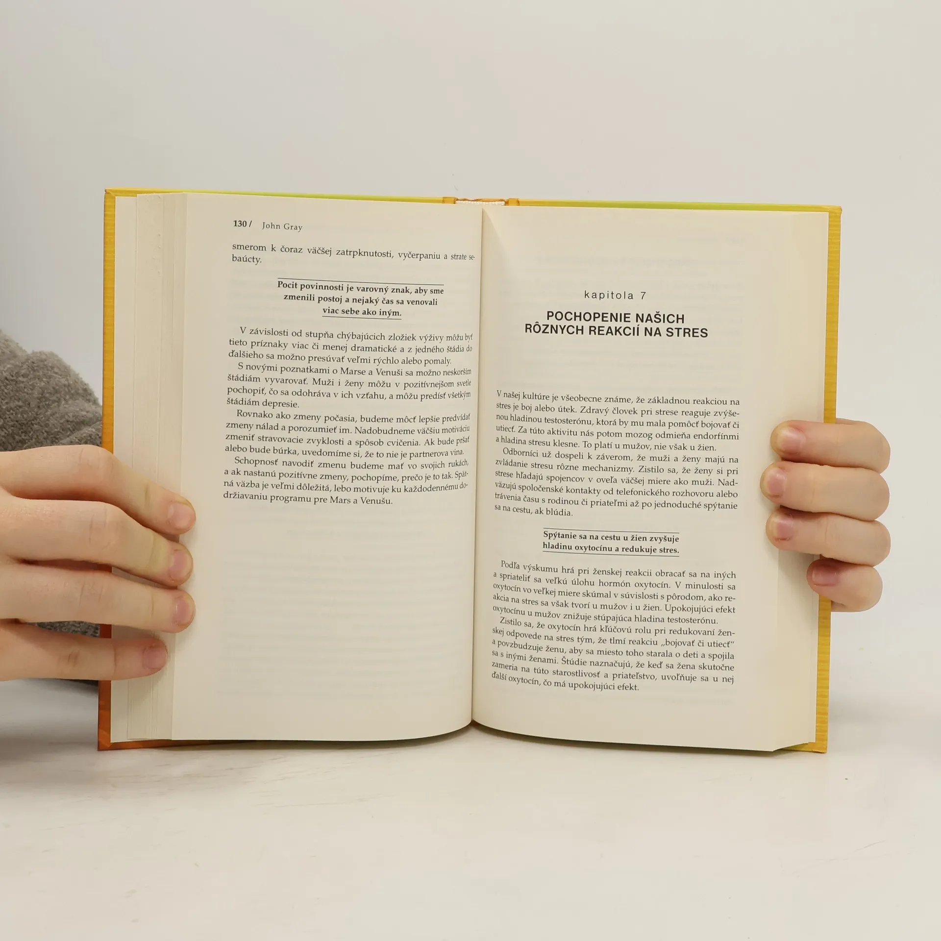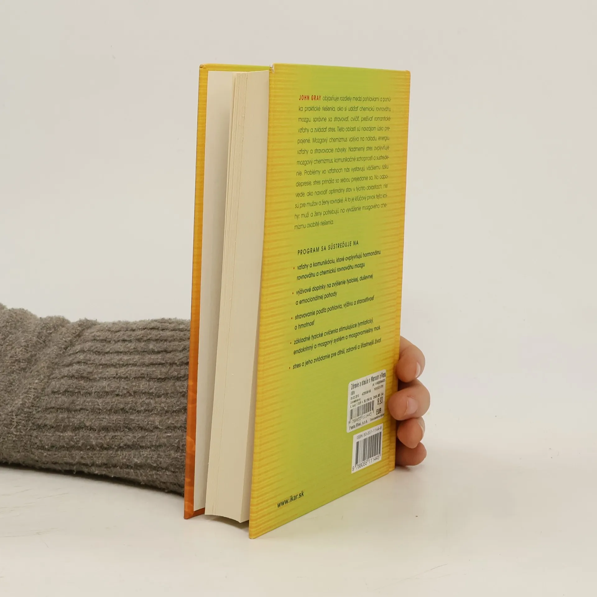 John Gray objasňuje rozdiely medzi pohlaviami a ponúka praktické riešenia, ako si udržať chemickú rovnováhu mozgu, správne sa stravovať, cvičiť, prežívať romantické vzťahy a zvládať stres. Tieto oblasti sú navzájom úzko prepojené. Mozgový chemizmus vplýva na náladu, energiu, vzťahy a stravovacie návyky. Nadmerný stres ovplyvňuje mozgový chemizmus, komunikačné schopnosti a sústredenie. Problémy vo vzťahoch nás vystavujú väčšiemu riziku depresie, stres prináša so sebou prejedanie sa. No odpovede, ako navodiť optimálny stav v týchto oblastiach, nie sú pre mužov a ženy rovnaké. A to je kľúčový prvok tejto knihy: muži a ženy potrebujú na vyváženie mozgového chemizmu osobité riešenia. Program sa sústreďuje na - vzťahy a komunikáciu, ktoré ovplyvňujú hormonálnu rovnováhu a chemickú rovnováhu mozgu - výživové doplnky na zvýšenie fyzickej, duševnej a emocionálnej pohody - stravovanie podľa pohlavia, výživu a starostlivosť o hmotnosť - základné fyzické cvičenia stimulujúce lymfatický, endokrinný a mozgový systém a mozgovomiešny mok - stres a jeho zvládanie pre dlhší, zdravší a šťastnejší život.