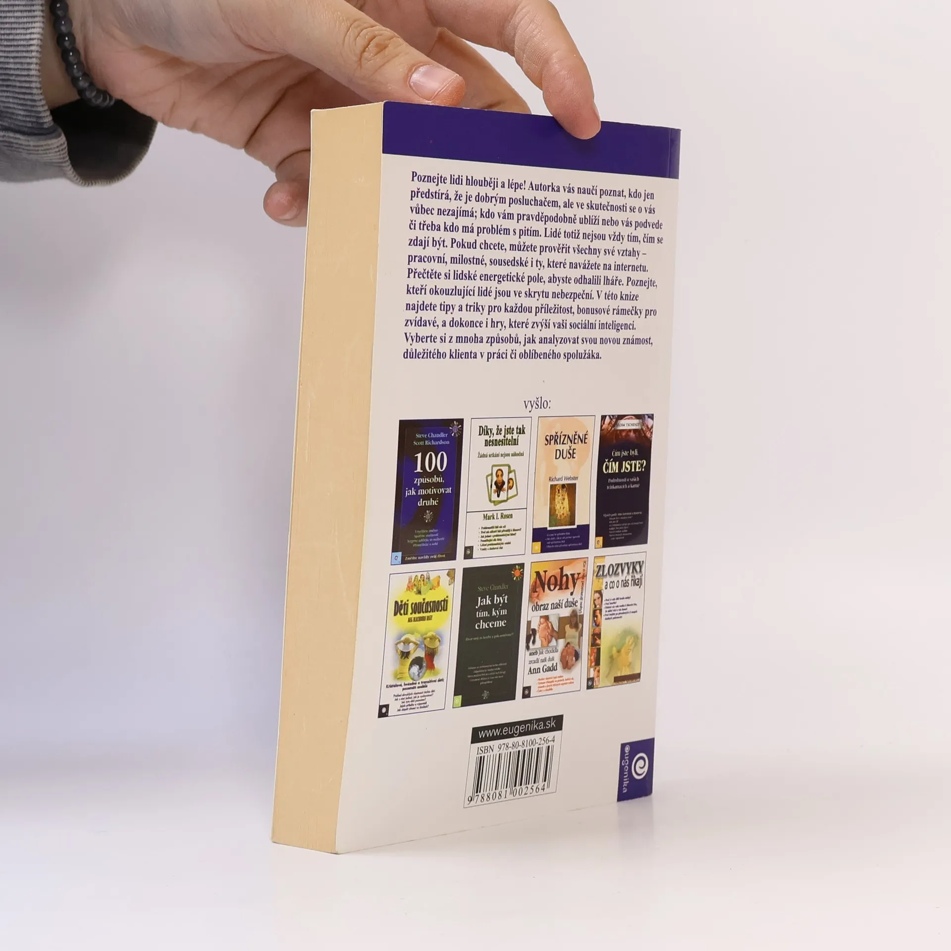 Autorka jedinečným způsobem kombinuje tři oblasti čtení osobnosti: rysy i mimiku obličeje, řeč těla a auru neboli lidské energetické pole. Poznejte například, kteří okouzlující lidé jsou ve skrytu nebezpeční. V této knize najdete tipy a triky pro každou příležitost, a dokonce i hry, které zvýší vaši sociální inteligenci. Vyberte si z mnoha způsobů, jak analyzovat svou novou známost, důležitého klienta či oblíbeného spolužáka.