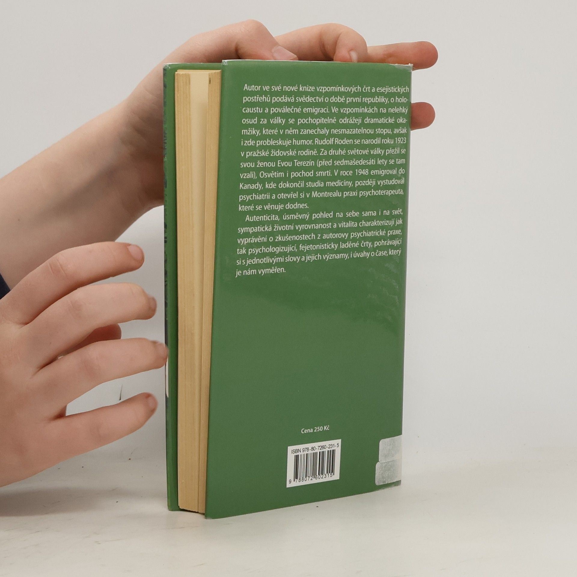 Autor ve své nové knize vzpomínkových črt a esejistických postřehů podává svědectví o době první republiky, o holocaustu a poválečné emigraci. Ve vzpomínkách na nelehký osud za války se pochopitelně odrážejí dramatické okamžiky, které v něm zanechaly nesmazatelnou stopu, avšak i zde probleskuje humor. Rudolf Roden se narodil roku 1923 v pražské židovské rodině. Za druhé světové války přežil se svou ženou Evou Terezín (před sedmašedesáti lety se tam vzali), Osvětim i pochod smrti. V roce 1948 emigroval do Kanady, kde dokončil studia medicíny, později vystudoval psychiatrii a otevřel si v Montrealu praxi psychoterapeuta, které se věnuje dodnes. Autenticita, úsměvný pohled na sebe sama i na svět, sympatická životní vyrovnanost a vitalita charakterizují jak vyprávění o zkušenostech z autorovy psychiatrické praxe, tak psychologizující, fejetonisticky laděné črty, pohrávající si s jednotlivými slovy a jejich významy, i úvahy o čase, který je nám vyměřen.