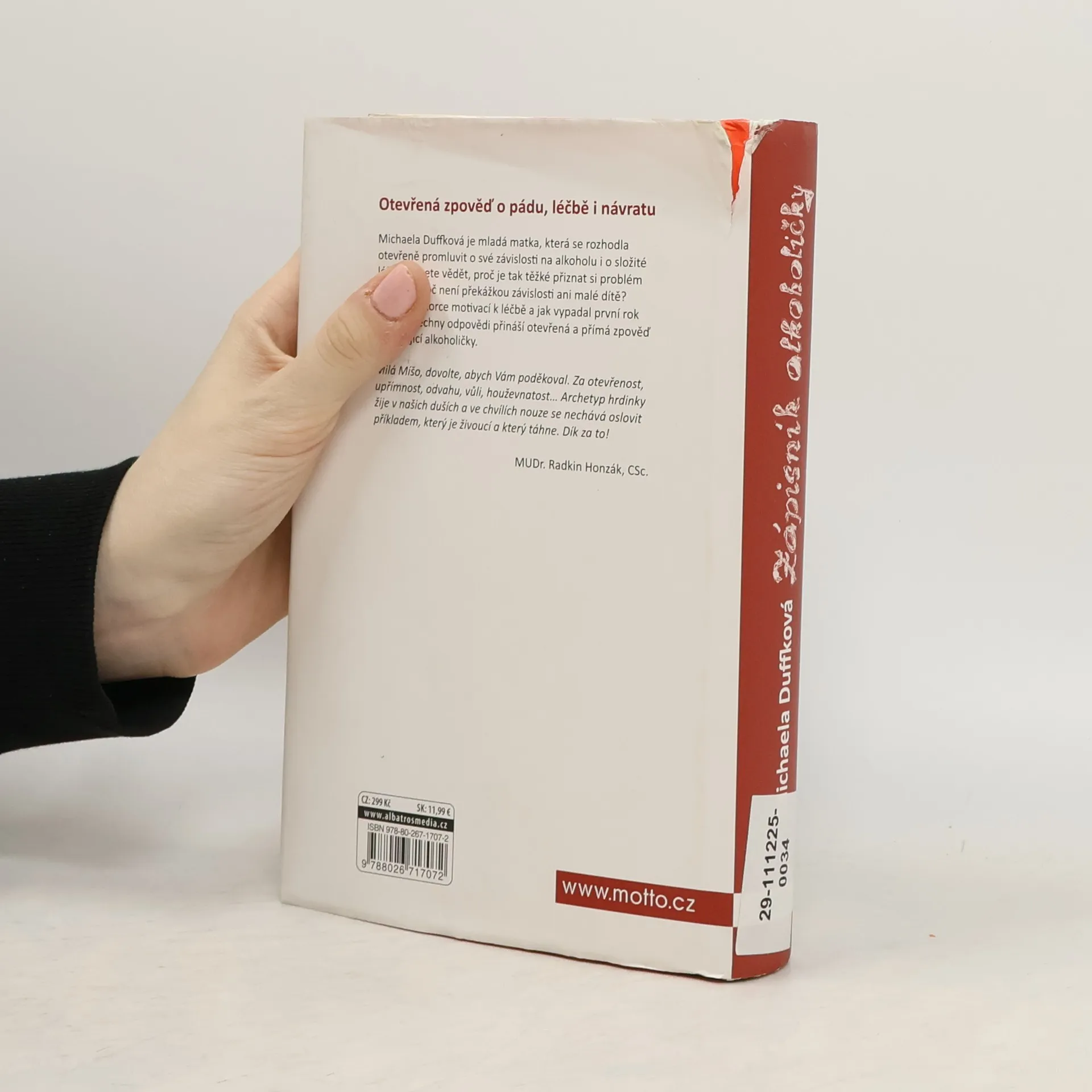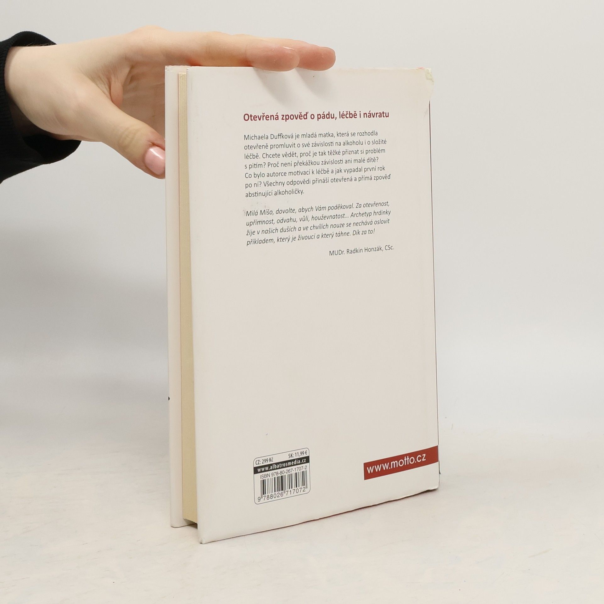 Poslední sklenička… dnes už popáté. Kniha podle blogu, který získal cenu Magnesia Litera. Michaela Duffková je mladá matka, která se rozhodla otevřeně promluvit o své závislosti na alkoholu i o složité léčbě. Chcete vědět, proč je tak těžké přiznat si problém s pitím? Proč není překážkou závislosti ani malé dítě? Co bylo autorce motivací k léčbě a jak vypadal první rok po ní? Všechny odpovědi přináší otevřená a přímá zpověď abstinující alkoholičky. Upřímně sdílená zkušenost o pádu doslova na dno vzbudila velký zájem veřejnosti, Michaela získala za svůj blog cenu Magnesia Litera a začala o závislosti veřejně přednášet. Dnes se věnuje svému vysněnému projektu – centru pro prevenci a léčbu závislosti na alkoholu. „Příběh Míši Duffkové je skvělým příspěvkem k destigmatizaci ženského alkoholismu a současně unikátní výpovědí o bolesti i naději.“ prof. PhDr. Michal Miovský, Ph.D. přednosta Kliniky adiktologie 1. LF UK a VFN