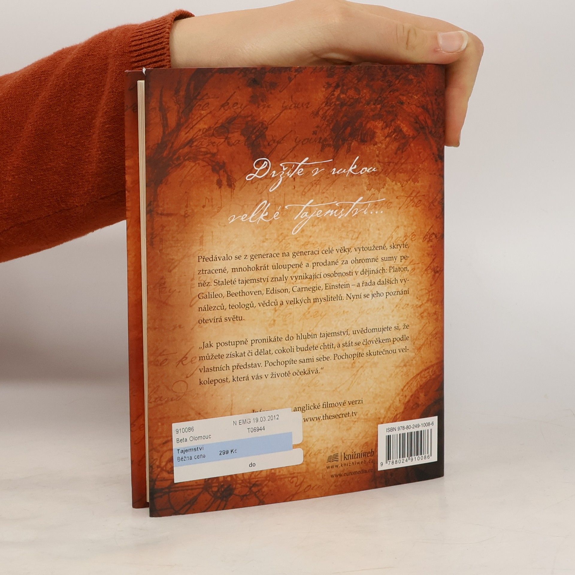 Stojíte na prahu poznání. Fragmenty velkého tajemství se objevují v legendách, mýtech a filozofiích po celá staletí, jen znát tu správnou šifru. Kniha, kterou právě držíte v rukou, shromáždila moudrost předchozích generací a naučí vás dosáhnout všeho, co si přejete - v oblasti peněz, zdraví, vztahů i osobního štěstí. Pochopíte skryté síly, které ve vás dřímají, a odhalíte jejich moc. Učení novodobých mistrů, kteří štěstí, zdraví a bohatství dosáhli, vám ukáže, jak lze tajemství spokojeného života aplikovat na každém kroku.