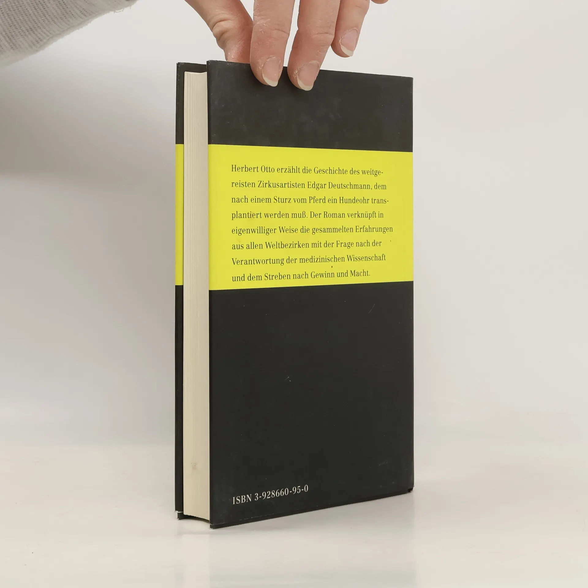 Herbert Otto erzählt die Geschichte des weitgereisten Zirkusartisten Edgar Deutschmann, dem nach einem Sturz vom Pferd ein Hundeohr transplantiert werden muß. Der Roman verknüpft in eigenwilliger Weise die gesammelten Erfahrungen aus allen Weltbezirken mit der Frage nach der Verantwortung der medizinischen Wissenschaft und dem Streben nach Gewinn und Macht.
